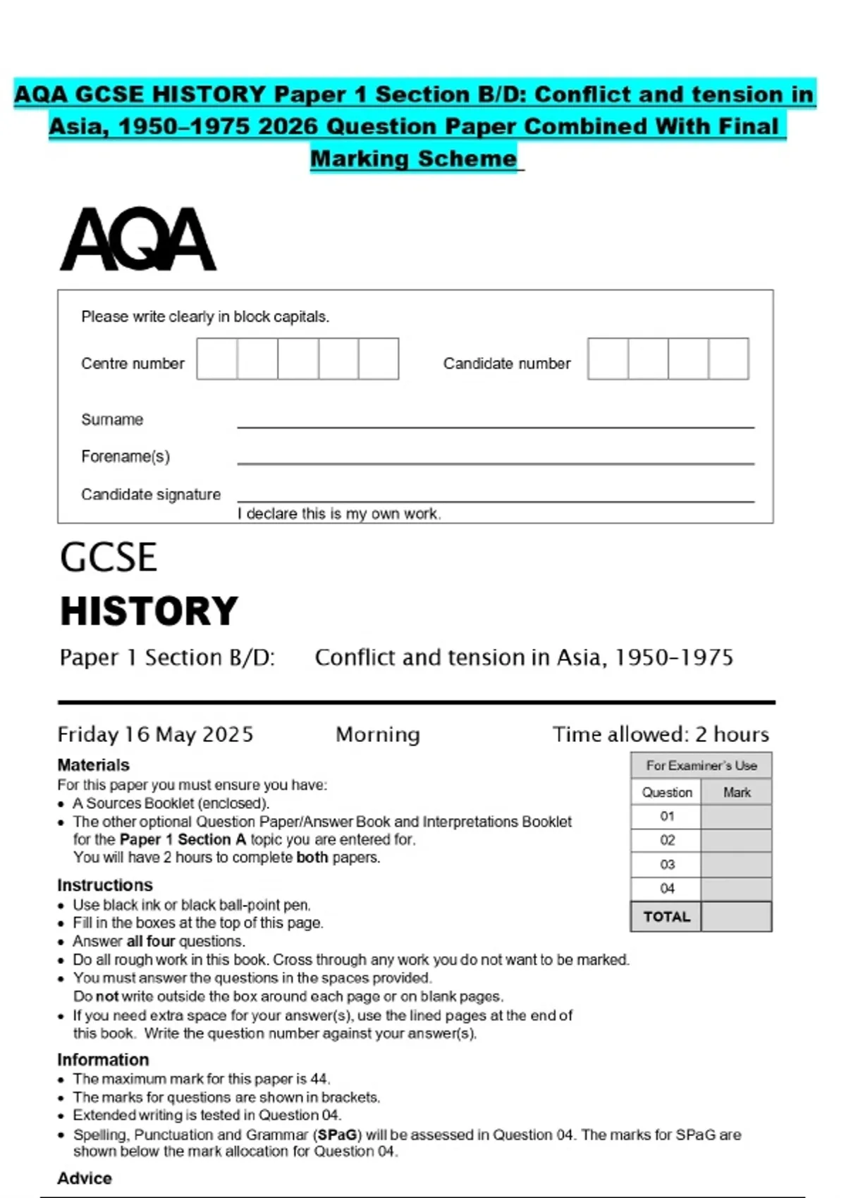 AQA GCSE HISTORY Paper 1 Section B/D: Conflict and tension in Asia, 1950– Question Paper Combined With Final Marking Scheme