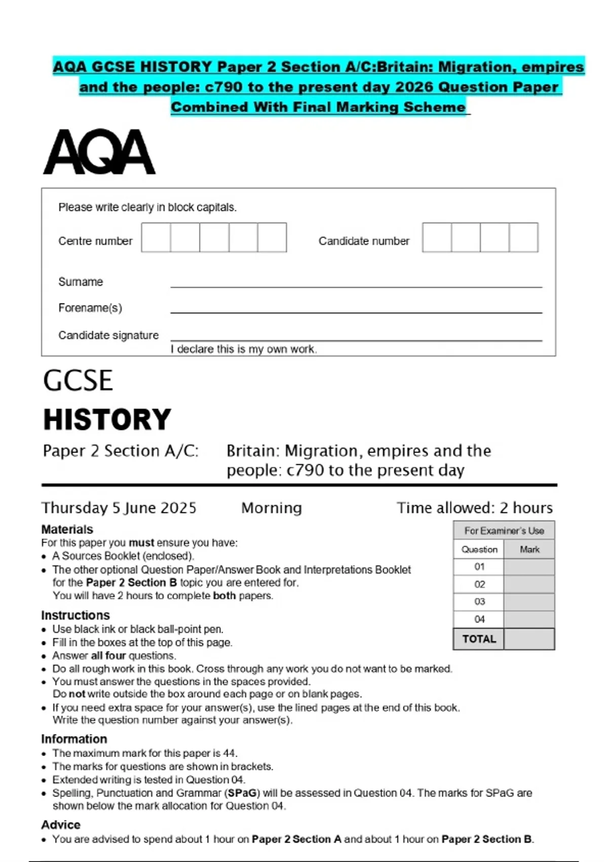 AQA GCSE HISTORY Paper 2 Section A/C:Britain: Migration, empires and the people: c790 to the present day 2026 Question Paper Combined With Final Marking Scheme