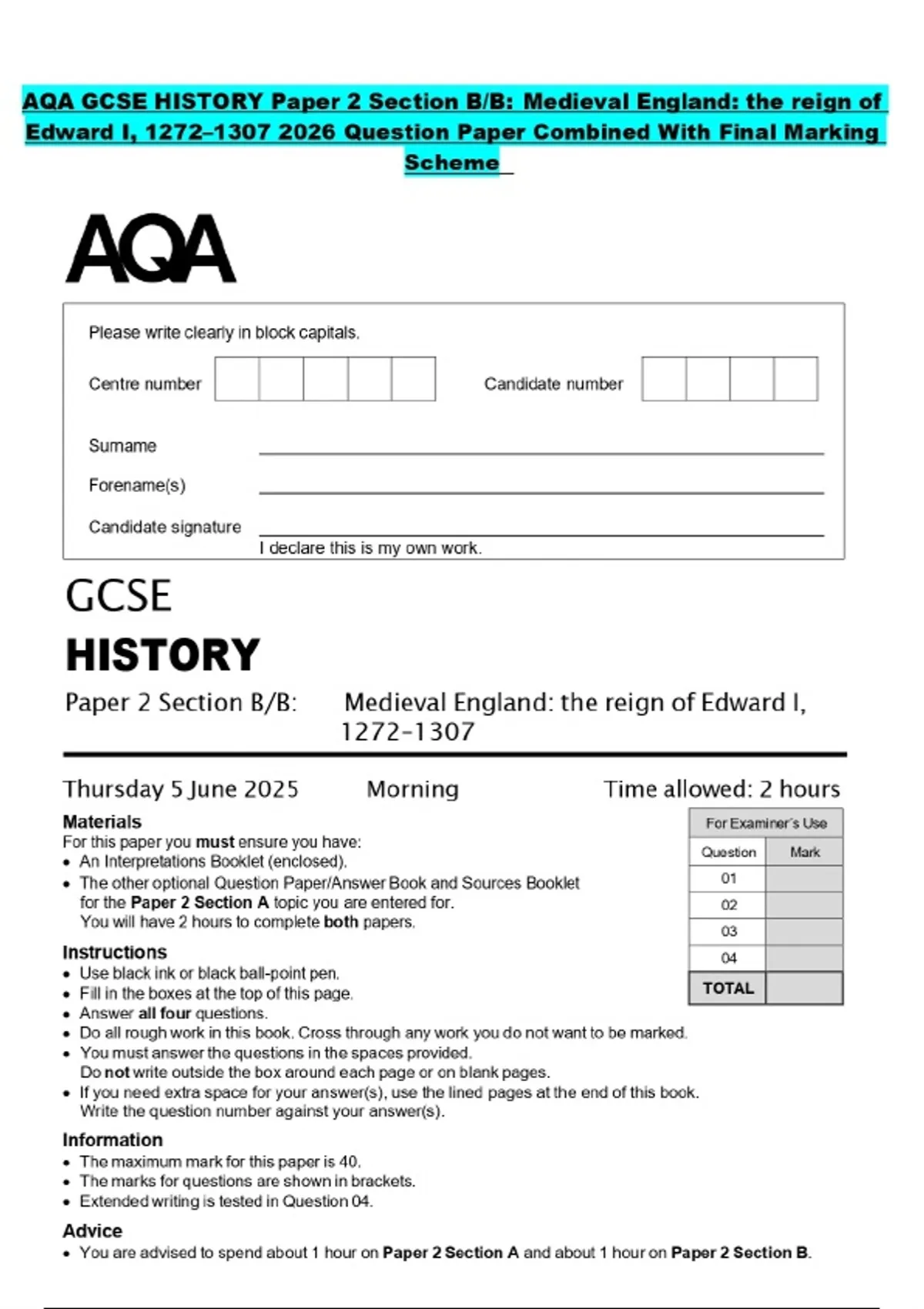AQA GCSE HISTORY Paper 2 Section B/B: Medieval England: the reign of Edward I, 1272– Question Paper Combined With Final Marking Scheme