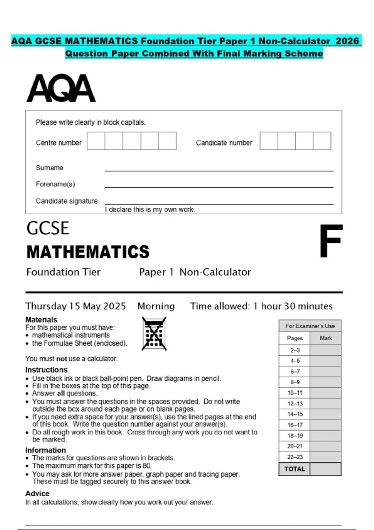 AQA GCSE MATHEMATICS Foundation Tier Paper 1 Non-Calculator 2026 Question Paper Combined With Final Marking Scheme