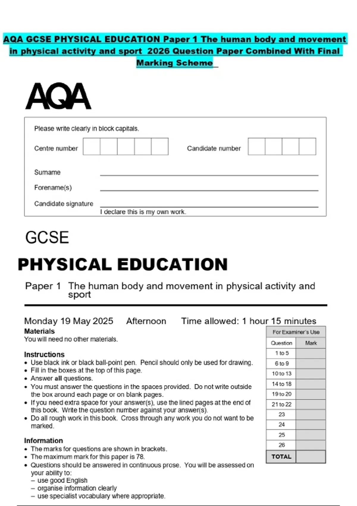 AQA GCSE PHYSICAL EDUCATION Paper 1 The human body and movement in physical activity and sport 2026 Question Paper Combined With Final Marking Scheme