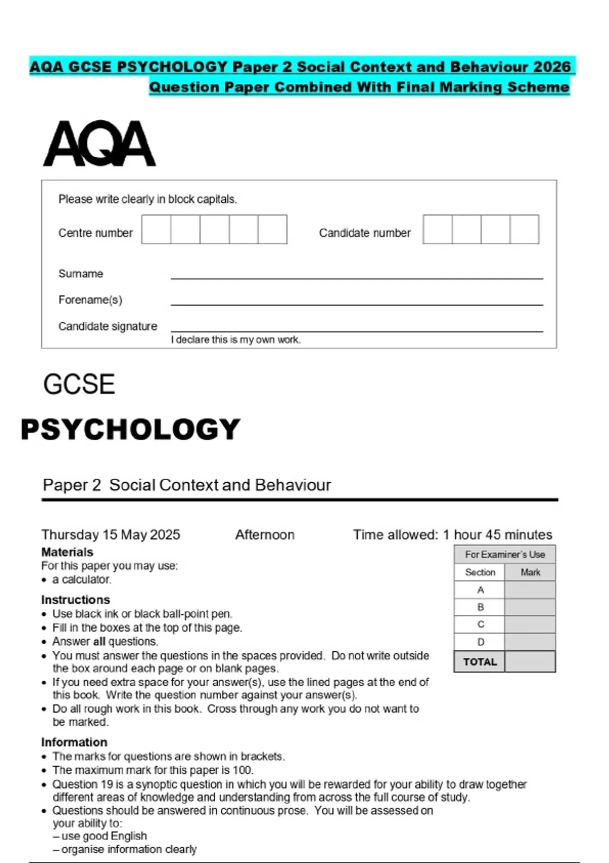 AQA GCSE PSYCHOLOGY Paper 2 Social Context and Behaviour 2026 Question Paper Combined With Final Marking Scheme