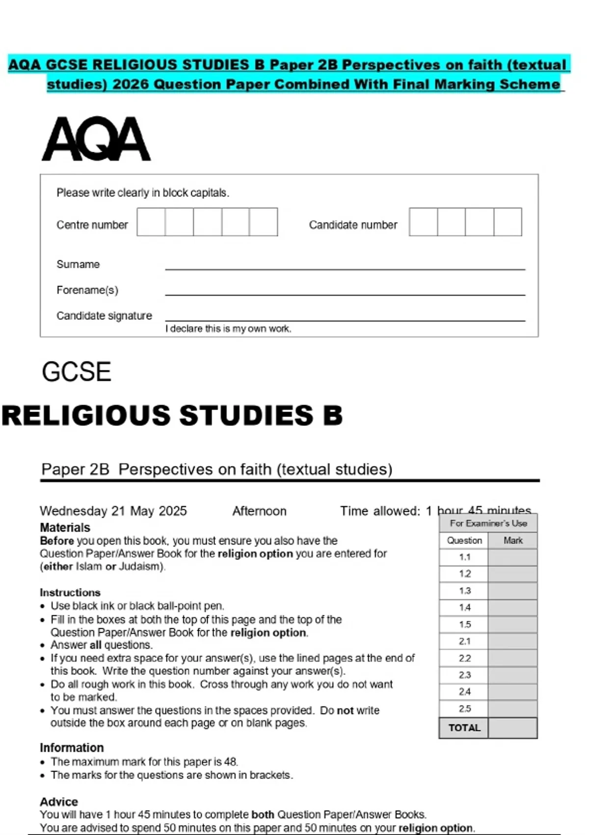 AQA GCSE RELIGIOUS STUDIES B Paper 2B Perspectives on faith (textual studies) 2026 Question Paper Combined With Final Marking Scheme