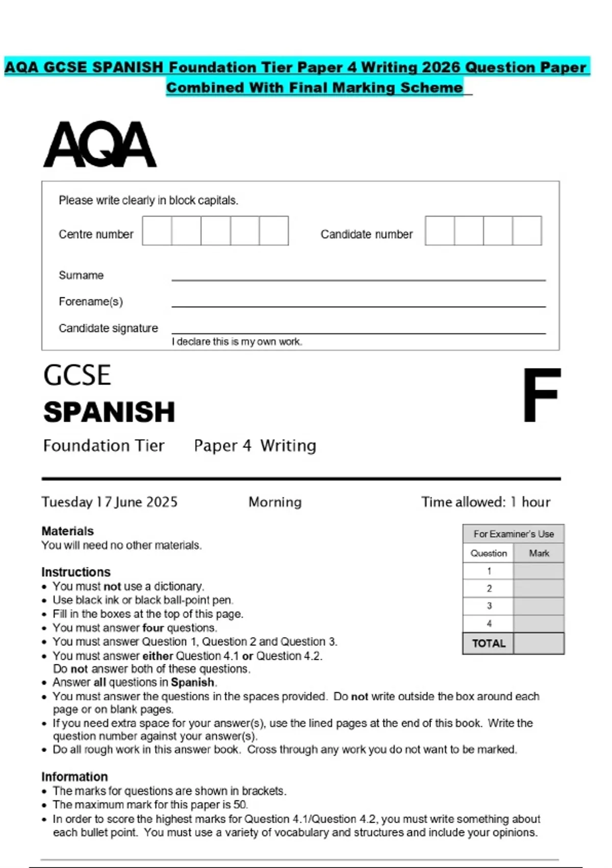 AQA GCSE SPANISH Foundation Tier Paper 4 Writing 2026 Question Paper Combined With Final Marking Scheme