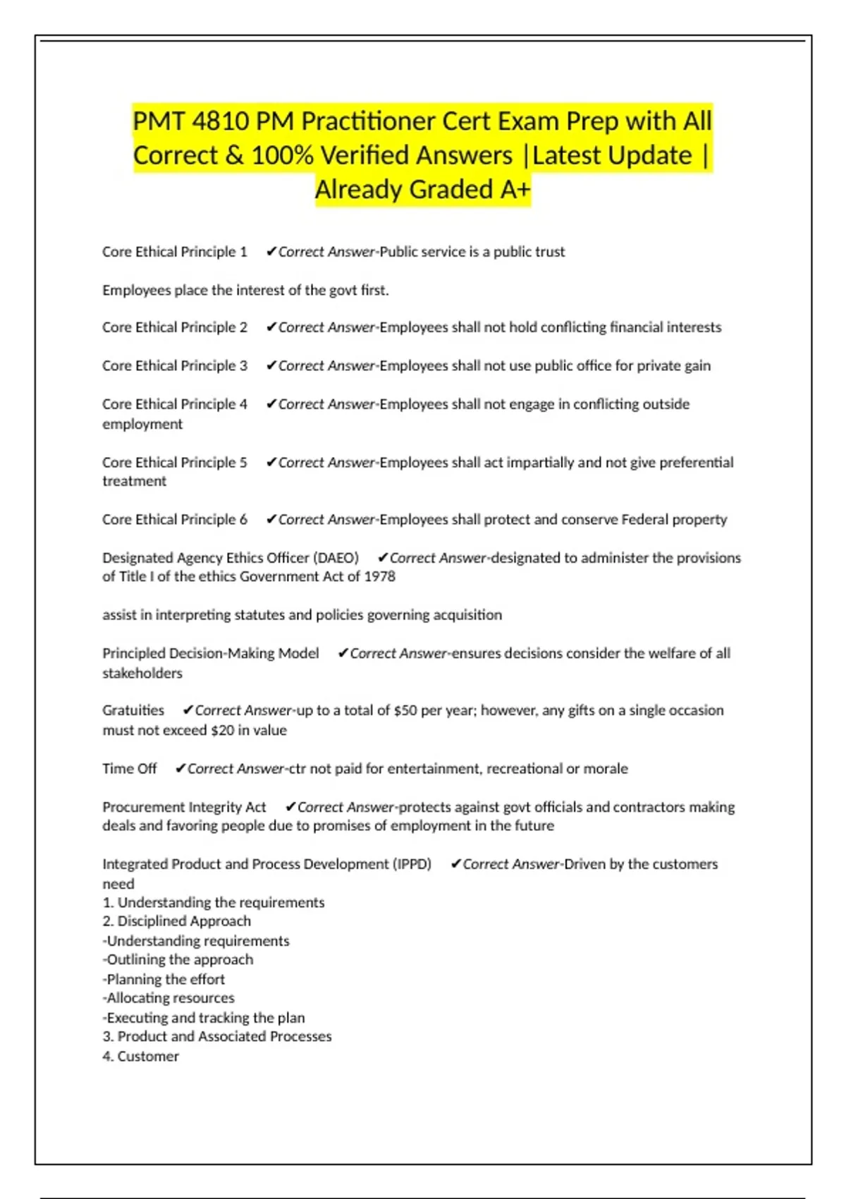 Core Ethical Principle 4 ✔Correct Answer-Employees shall not engage in conflicting outside