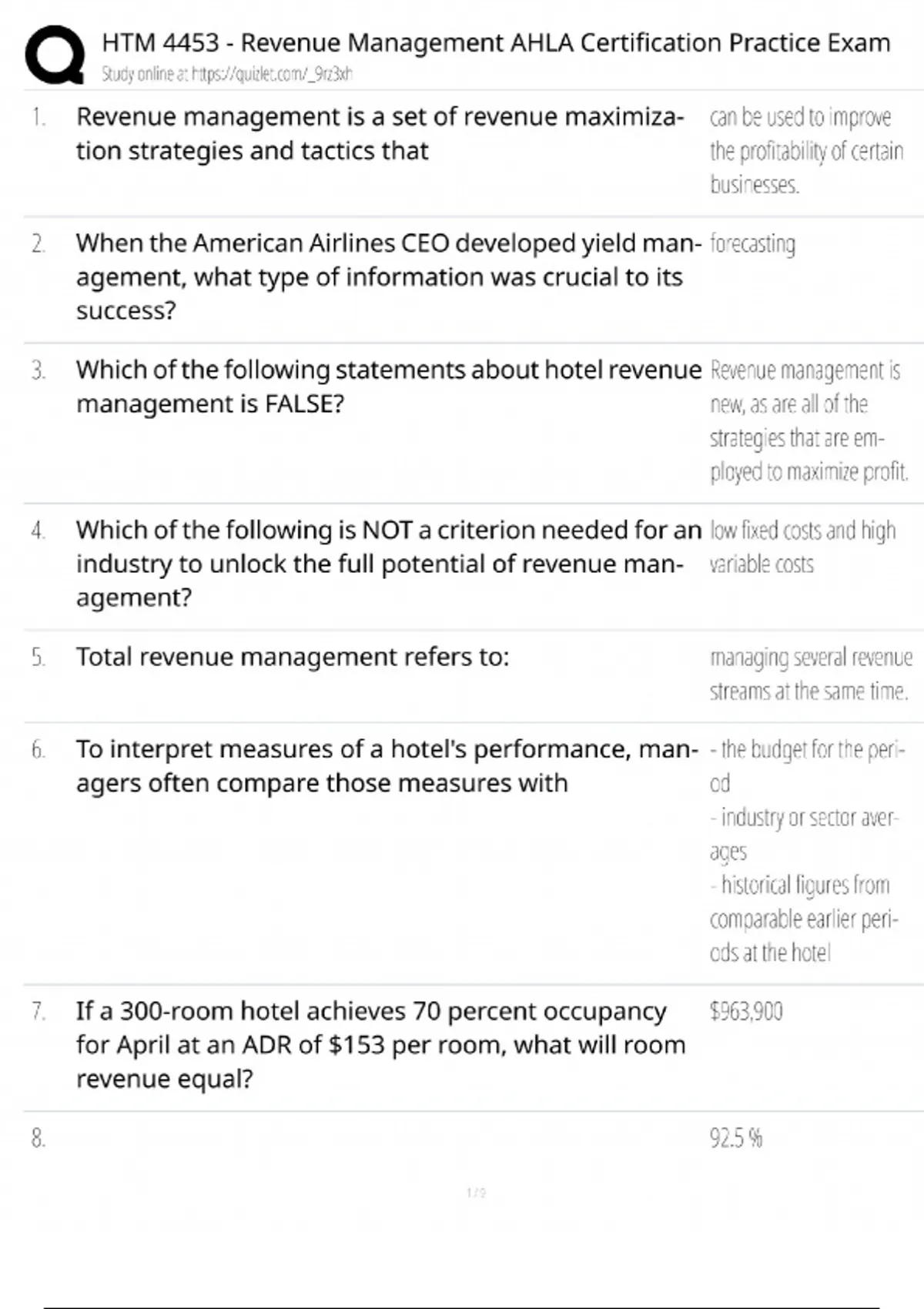 HTM 4453 Revenue Management AHLA Certification Practice Exam / Score 100% / New 2025 Update / Study Guide