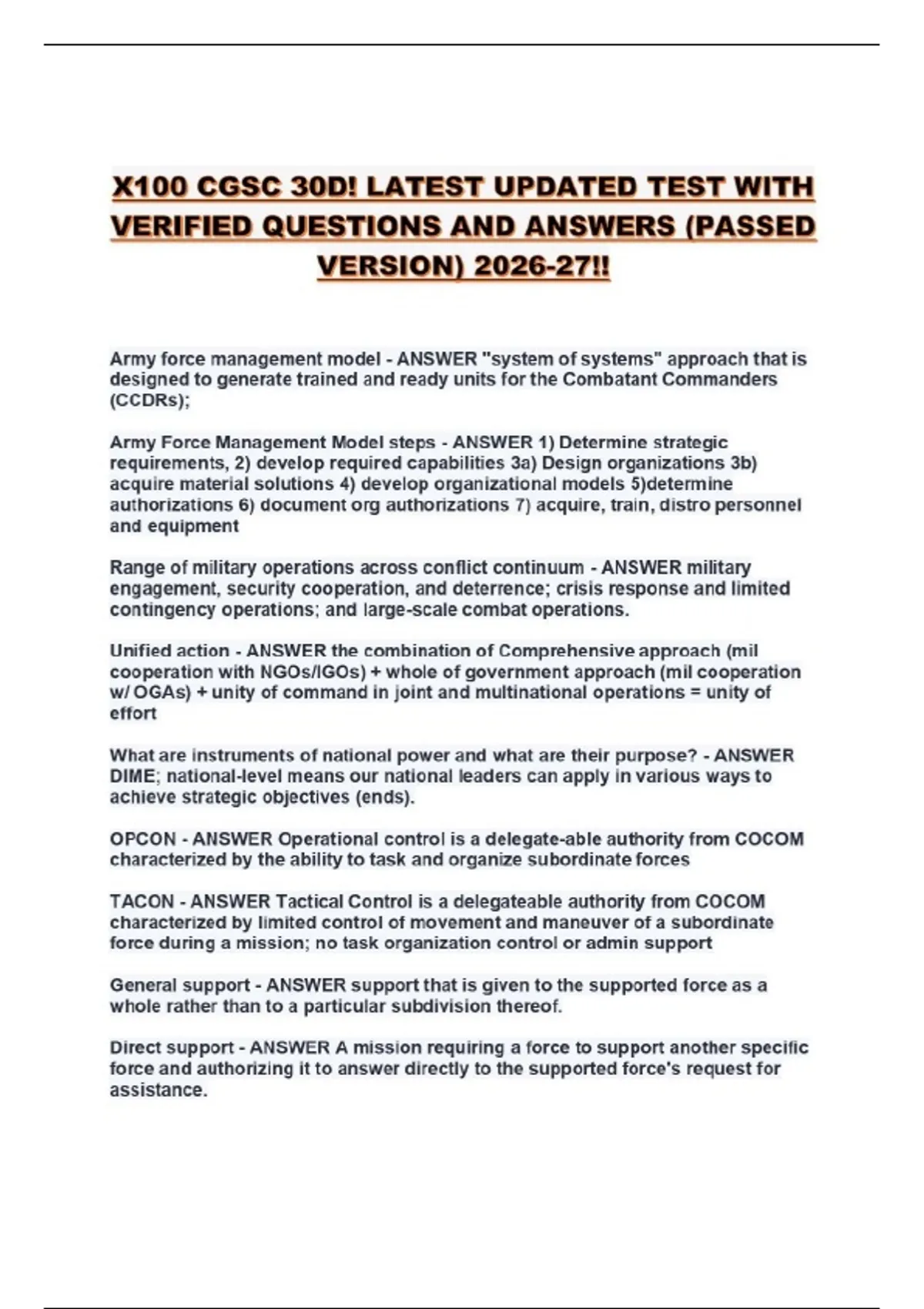 X100 CGSC 30D! LATEST UPDATED TEST WITH VERIFIED QUESTIONS AND ANSWERS (PASSED VERSION) 2026-27!!...
