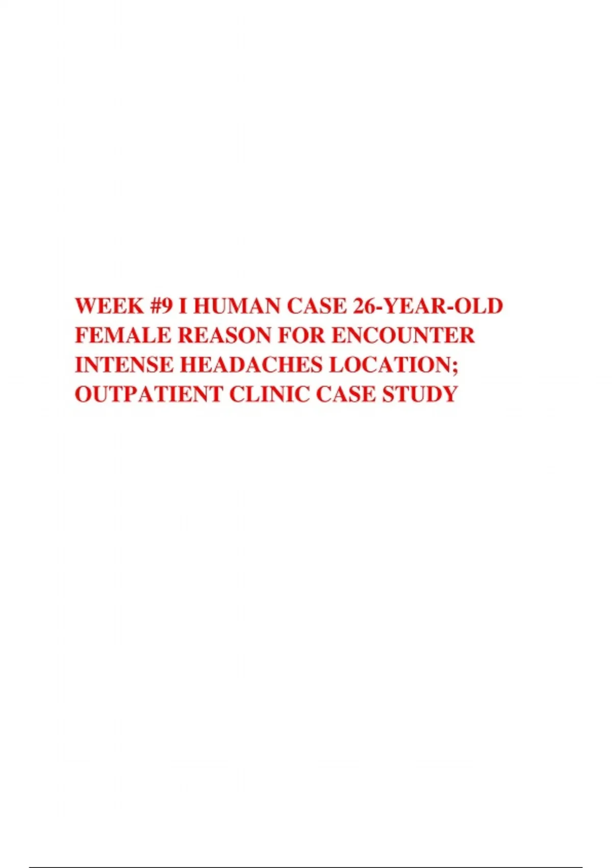 Successfully complete your Week 9 iHuman assignment with this focused guide for the case of a 26-year-old female presenting to an outpatient clinic with intense headaches. This resource provides a structured clinical framework, beginning with a detailed History of Present Illness (HPI) exploring headache characteristics, red flag symptoms, and relevant medical and social history. It includes a thorough Physical and Neurological Examination guide, a prioritized Differential Diagnosis list (considering migraine, tension-type headache, cluster headache, and secondary causes), and a comprehensive Management Plan for the outpatient setting. The plan covers appropriate diagnostic workup, evidence-based pharmacological and non-pharmacological interventions, patient education on triggers and lifestyle modifications, and clear follow-up criteria. This guide is designed to help you demonstrate safe, effective, and patient-centered clinical reasoning in a primary care simulation.