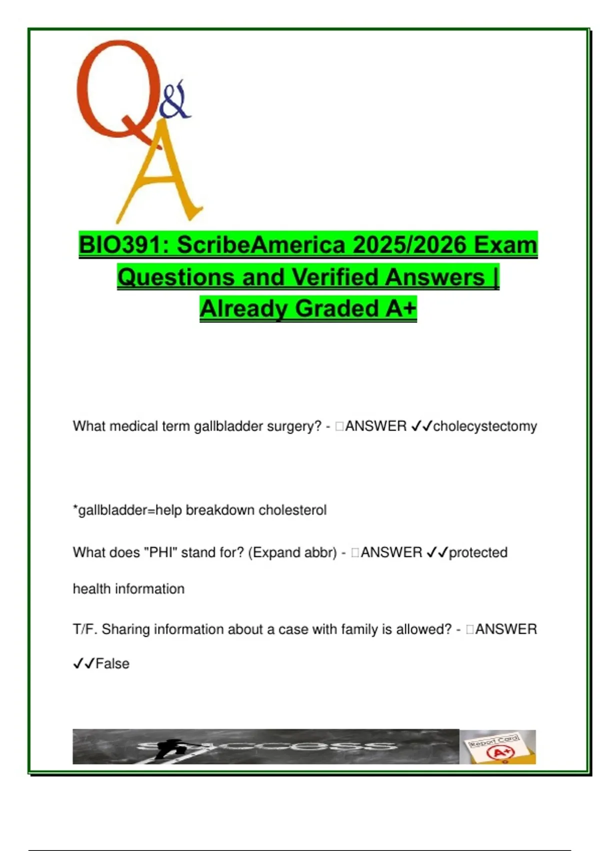 This document is a comprehensive, all-in-one final exam review resource for BIO391 ScribeAmerica (2025/2026), containing 250+ verified exam questions and answers that span the full outpatient scribe curriculum. It integrates material from all ScribeAmerica courses into a single, high-yield study guide designed for cumulative finals, certification-style exams, and real-world clinical readiness. The content provides in-depth coverage of SOAP note documentation, including Subjective (chief complaint, HPI structures, ROS accuracy), Objective (vital signs, normal vs abnormal physical exam findings across all body systems), Assessment (problem lists, diagnostic summaries, prognosis), and Plan (treatments, medications, referrals, follow-up timelines). Clear distinctions are made between simple, brief, and comprehensive assessment structures, with strong emphasis on avoiding contradictions and maintaining billing compliance. A major portion of the document focuses on outpatient billing and coding, explaining Evaluation & Management (E&M) levels, documentation requirements for new versus established patients, time-based counseling rules, and medical decision-making complexity. It thoroughly differentiates ICD-10 diagnosis codes, CPT procedure codes, Z-codes for preventive care, modifiers, and superbill requirements, using realistic exam-style scenarios to reinforce correct billing determination. The guide also delivers extensive instruction on HIPAA, HITECH, MACRA, MIPS, PHI protection, and compliance rules, clearly outlining what scribes may and may not do in clinical settings and the legal consequences of violations. In addition, it includes a large medical terminology and abbreviation section covering common diagnoses, procedures, symptoms, physical exam findings, imaging, labs, medications, and documentation shorthand used daily in outpatient, internal medicine, and urgent care clinics. This resource is ideal for Medical Scribe trainees, ScribeAmerica students, and learners in Health Sciences, Pre-Med, Pre-PA, Pre-Nursing, Allied Health, and Clinical Documentation programs. It is especially valuable for students preparing for cumulative finals, scribe certification exams, onboarding assessments, or clinical practicums, offering a single, structured reference that mirrors both exam expectations and real clinical workflows. Keywords: medical scribe final exam, SOAP notes, clinical documentation, HPI writing, physical exam findings, outpatient billing, E&M levels, ICD-10 codes, CPT codes, HIPAA compliance, medical terminology, clinical abbreviations, medical decision making, ScribeAmerica training, BIO391
