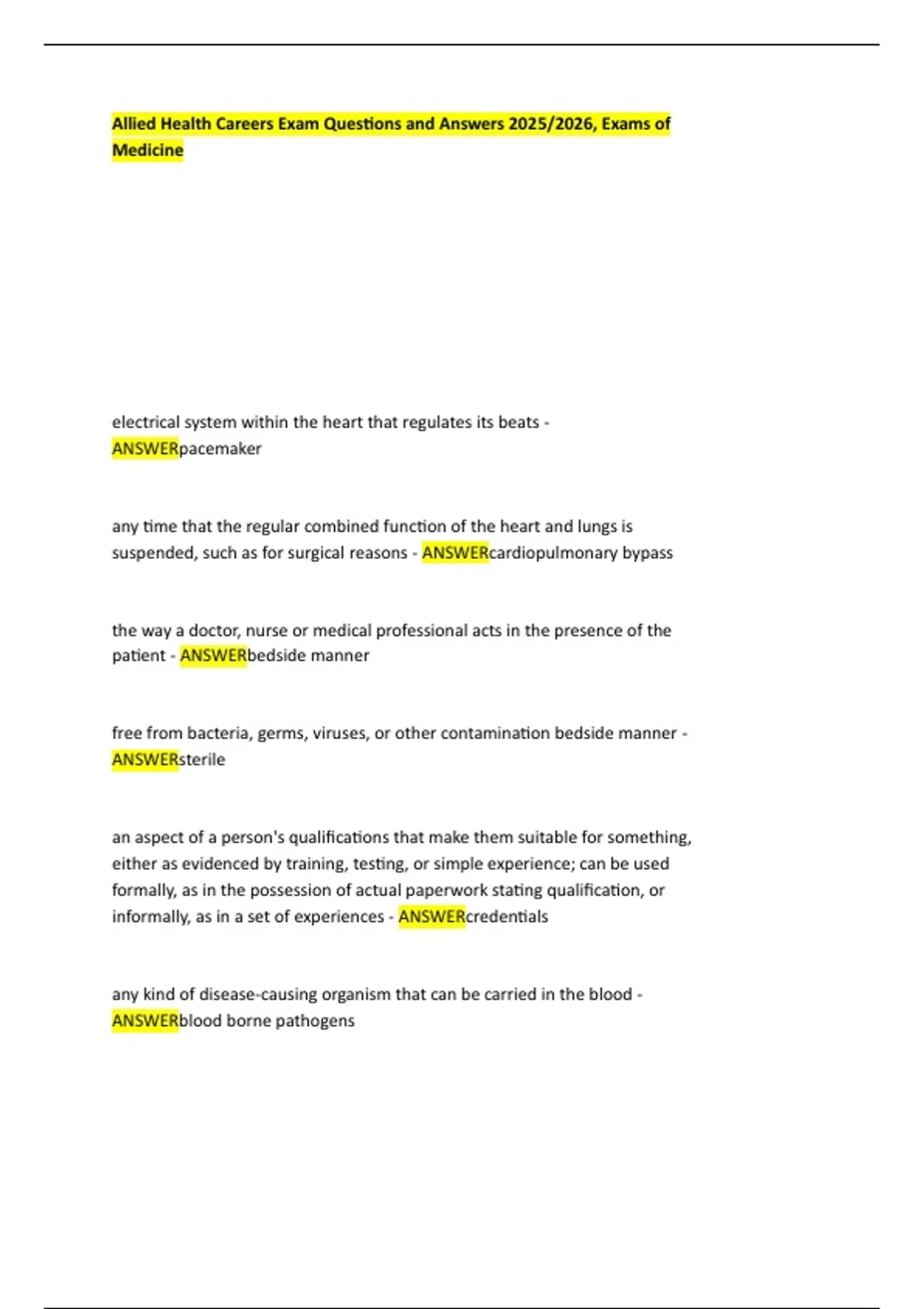 Allied Health Careers Exam Questions and Answers 2025/2026, Exams of