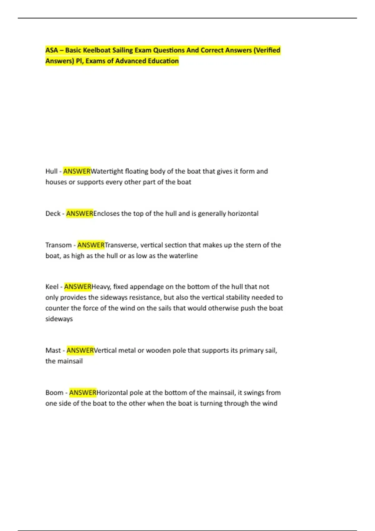 ASA – Basic Keelboat Sailing Exam Questions And Correct Answers (Verified