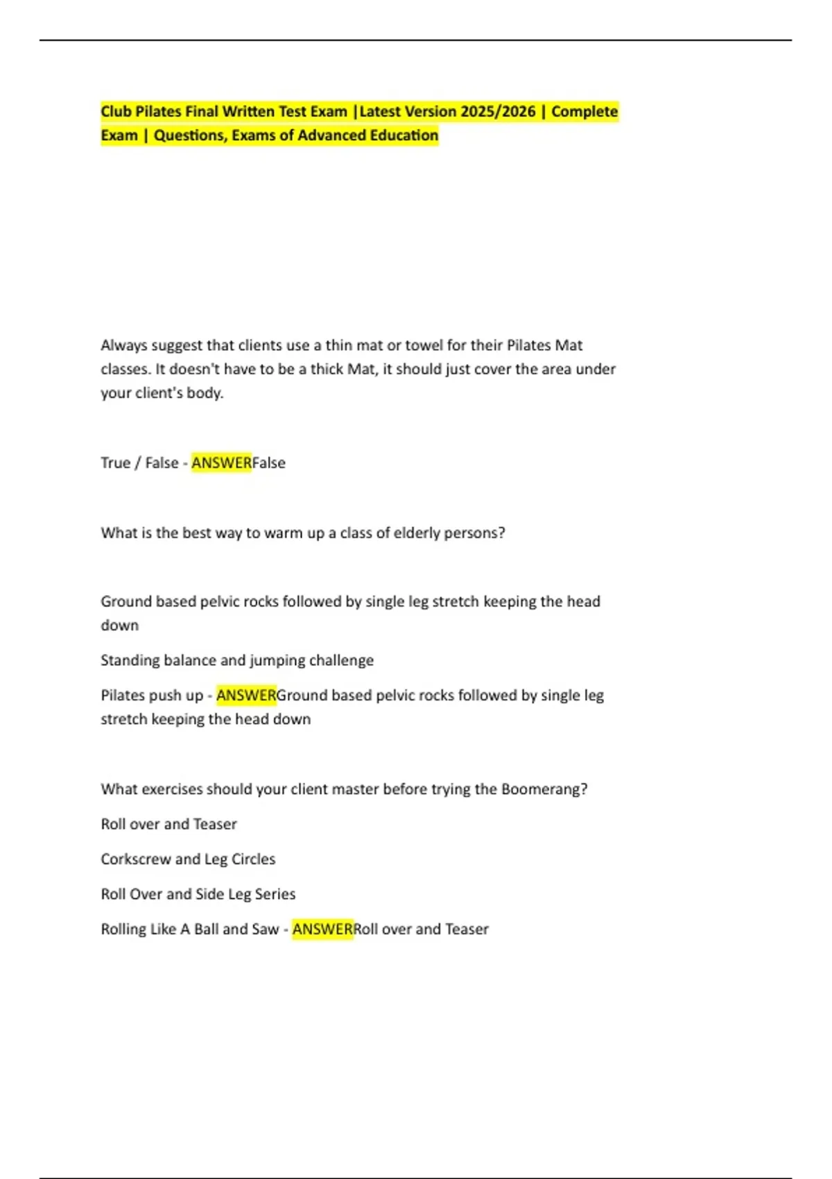 Club Pilates Final Written Test Exam |Latest Version 2025/2026 | Complete