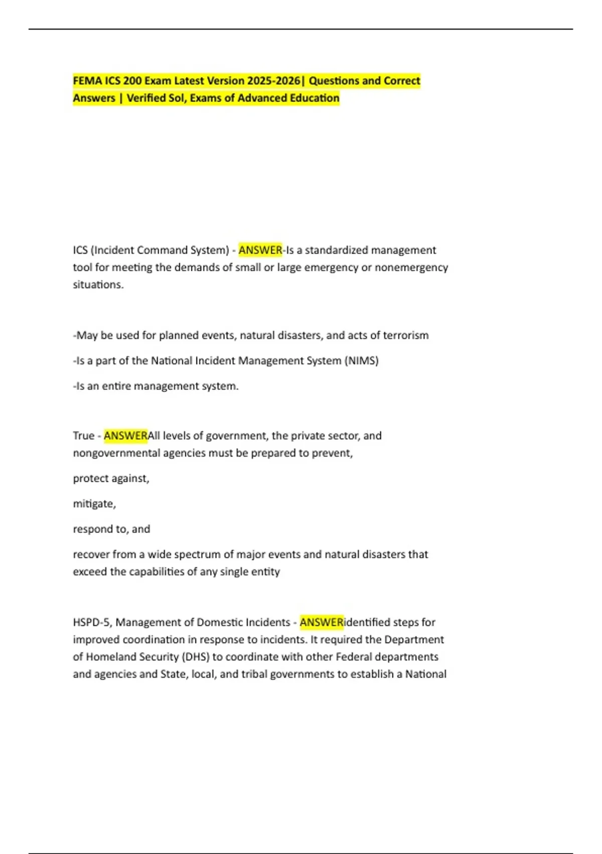 FEMA ICS 200 Exam Latest Version | Questions and Correct Answers | Verified Sol, Exams of Advanced Education