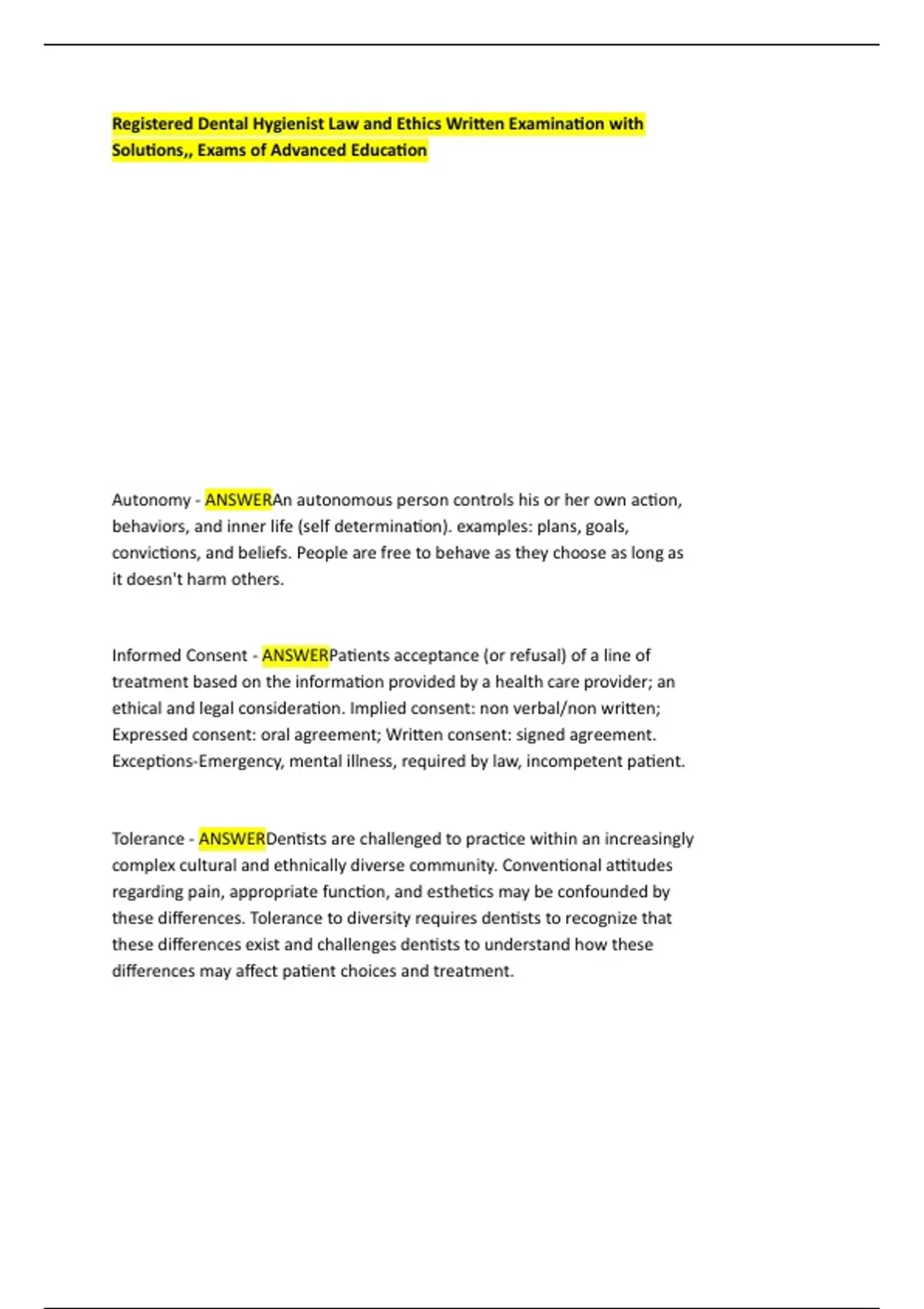 Registered Dental Hygienist Law and Ethics Written Examination with Solutions,, Exams of Advanced Education