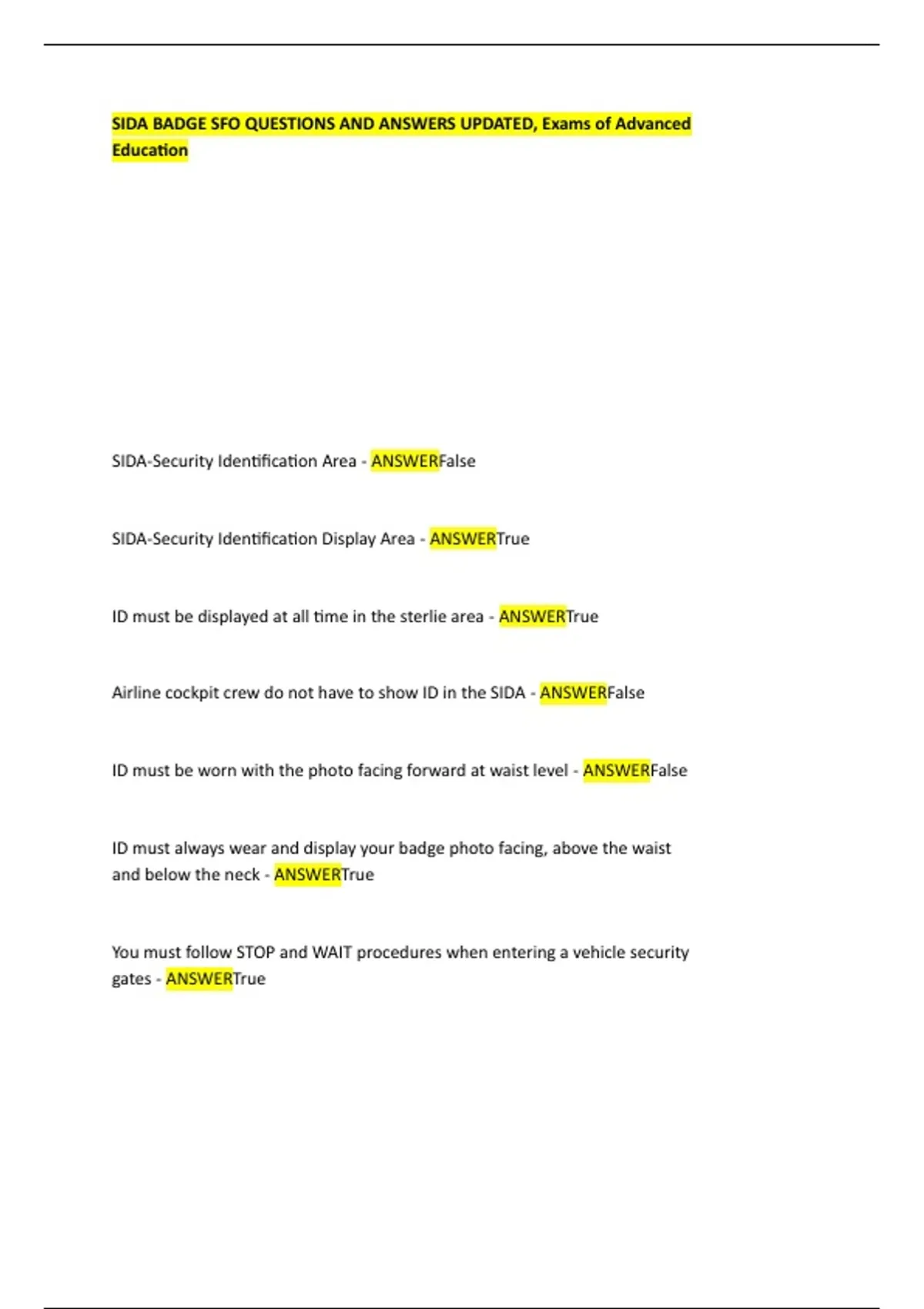 SIDA BADGE SFO QUESTIONS AND ANSWERS UPDATED, Exams of Advanced