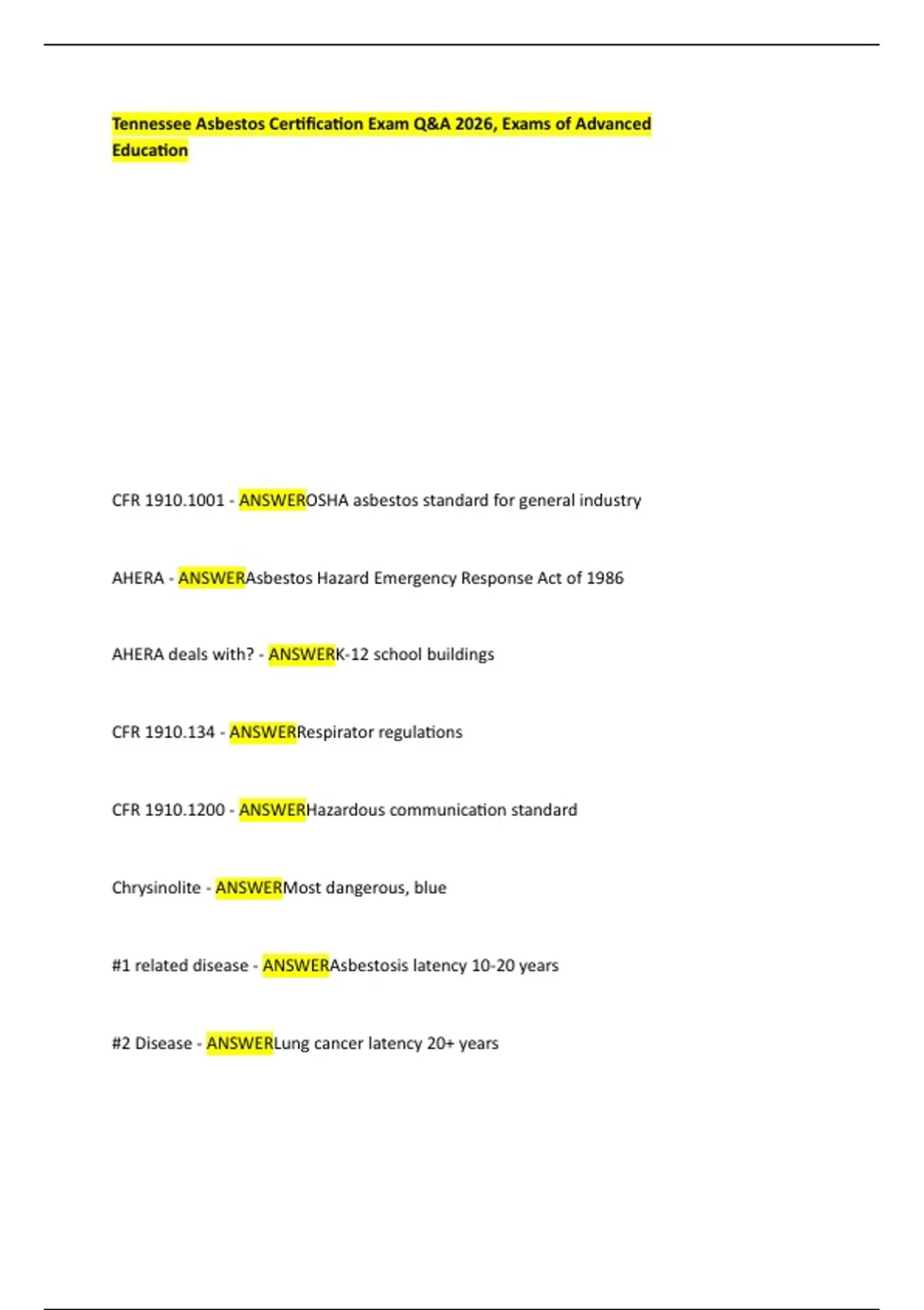 Tennessee Asbestos Certification Exam Q&A 2026, Exams of Advanced