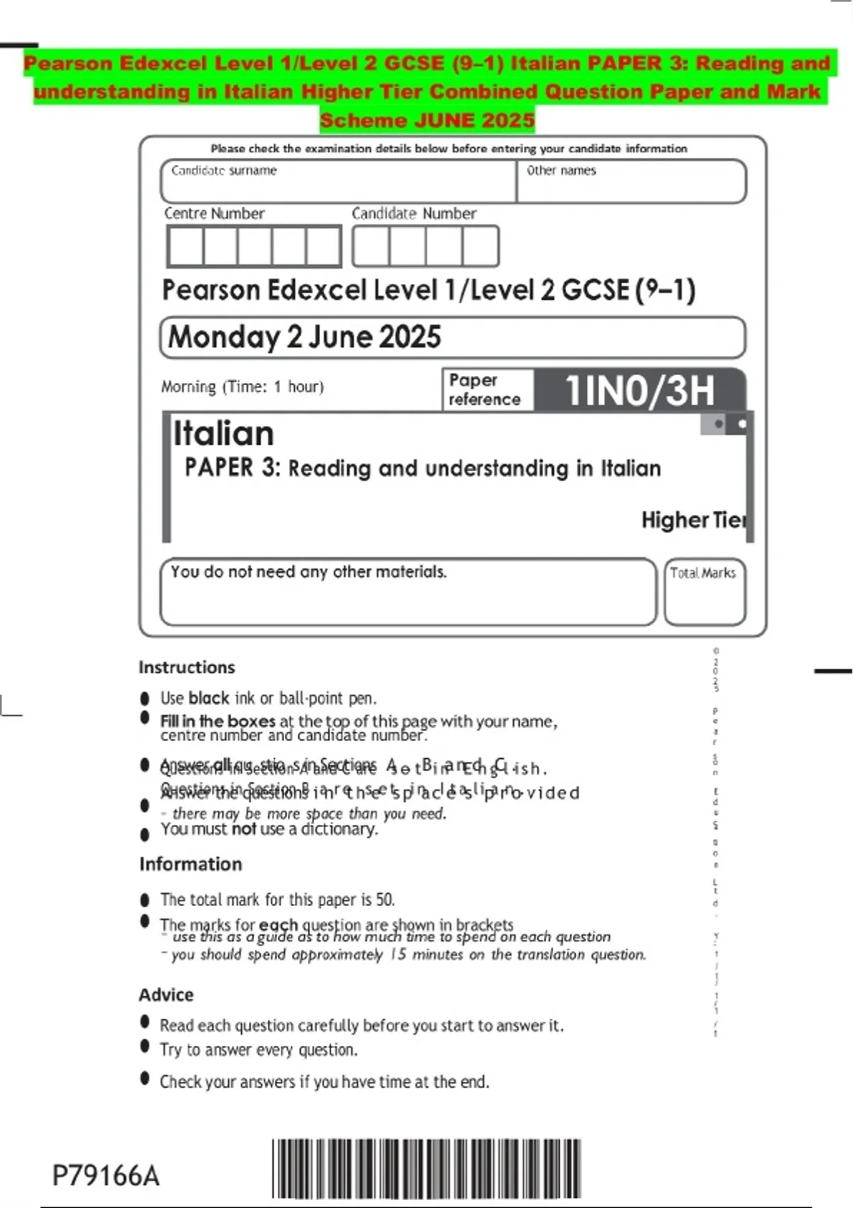 Pearson Edexcel Level 1/Level 2 GCSE (9–1) Italian PAPER 3: Reading and understanding in Italian Higher Tier Combined Question Paper and Mark Scheme JUNE 2025