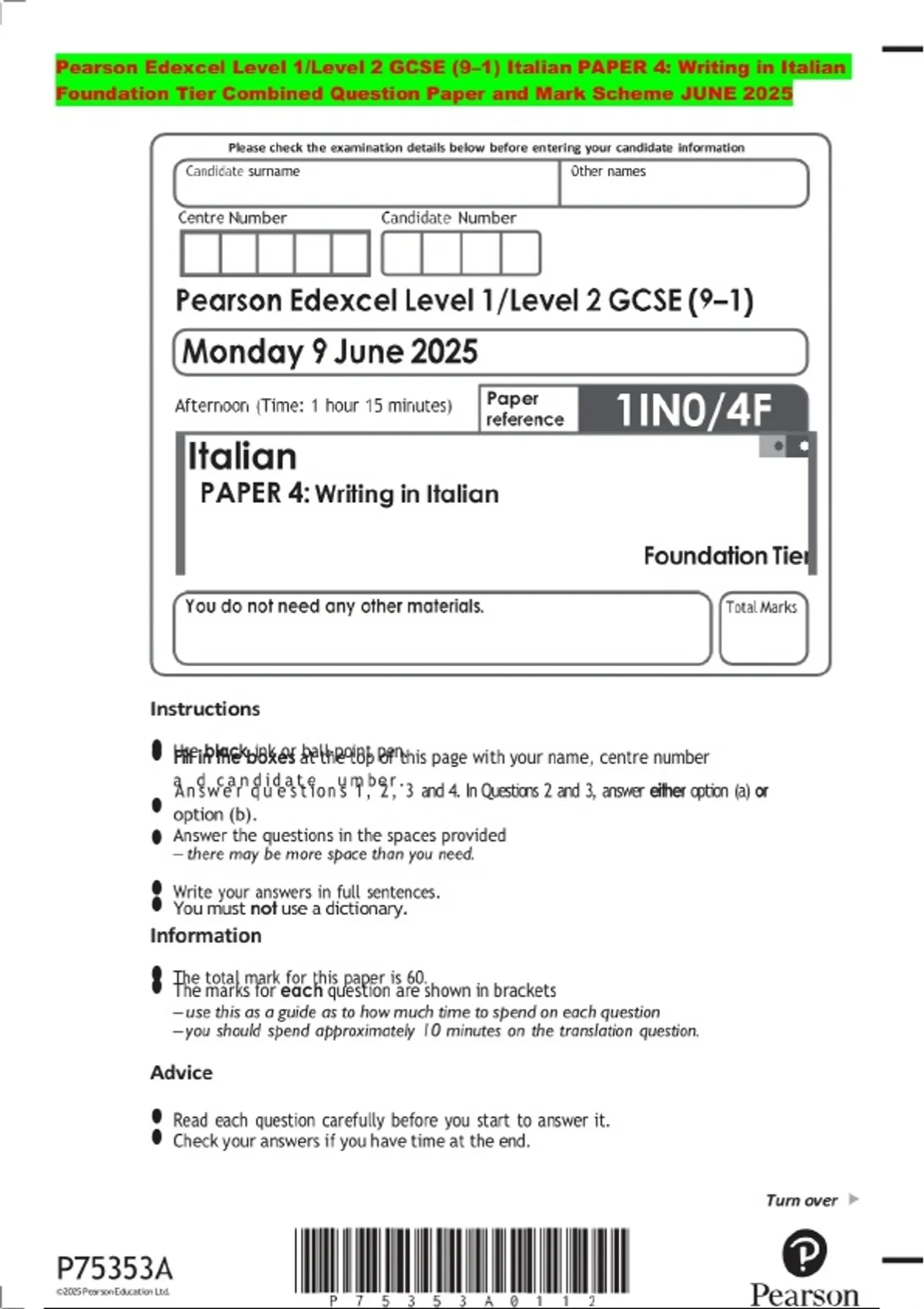 Pearson Edexcel Level 1/Level 2 GCSE (9–1) Italian PAPER 4: Writing in Italian Foundation Tier Combined Question Paper and Mark Scheme JUNE 2025