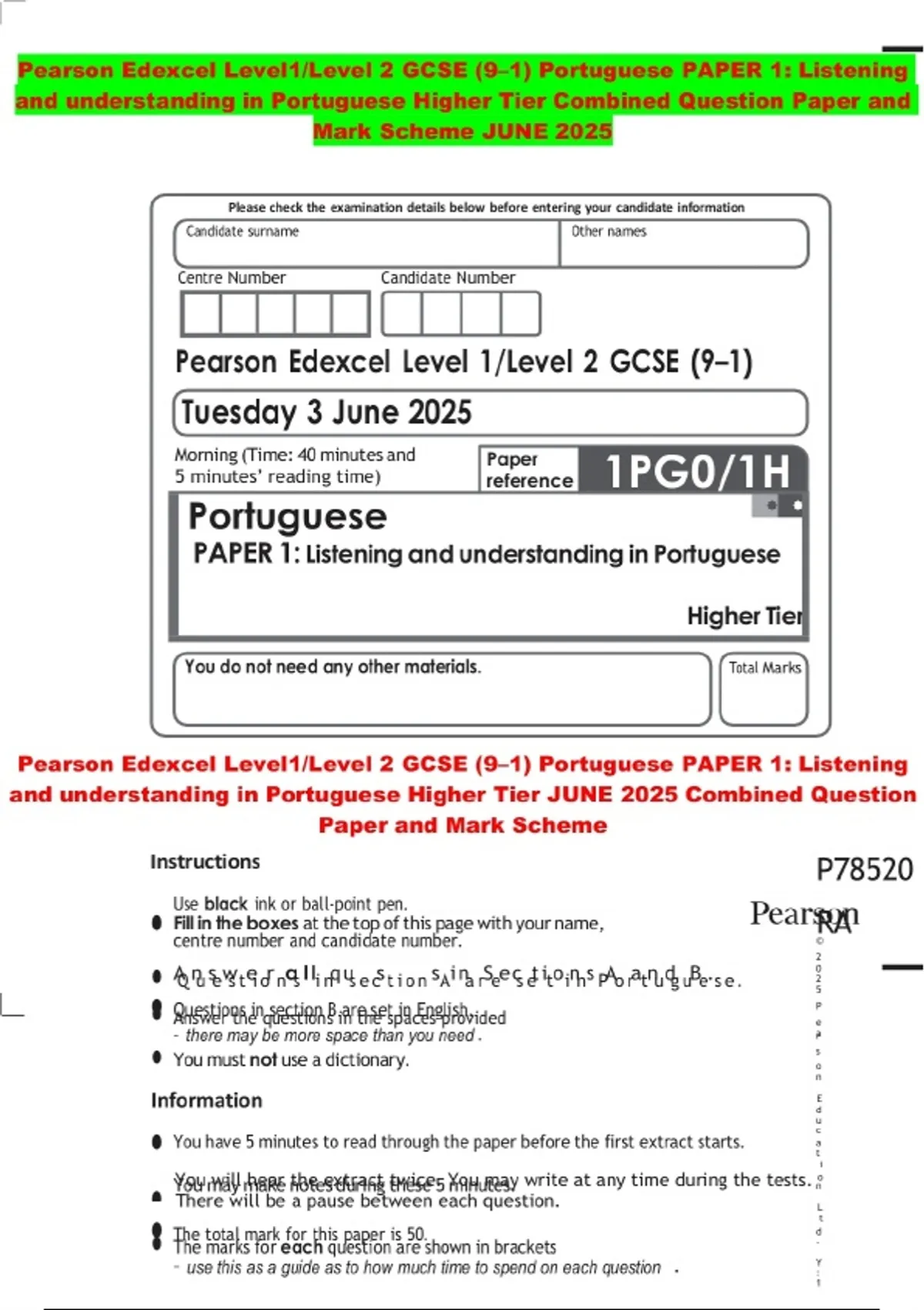 Pearson Edexcel Level1/Level 2 GCSE (9–1) Portuguese PAPER 1: Listening and understanding in Portuguese Higher Tier Combined Question Paper and Mark Scheme JUNE 2025