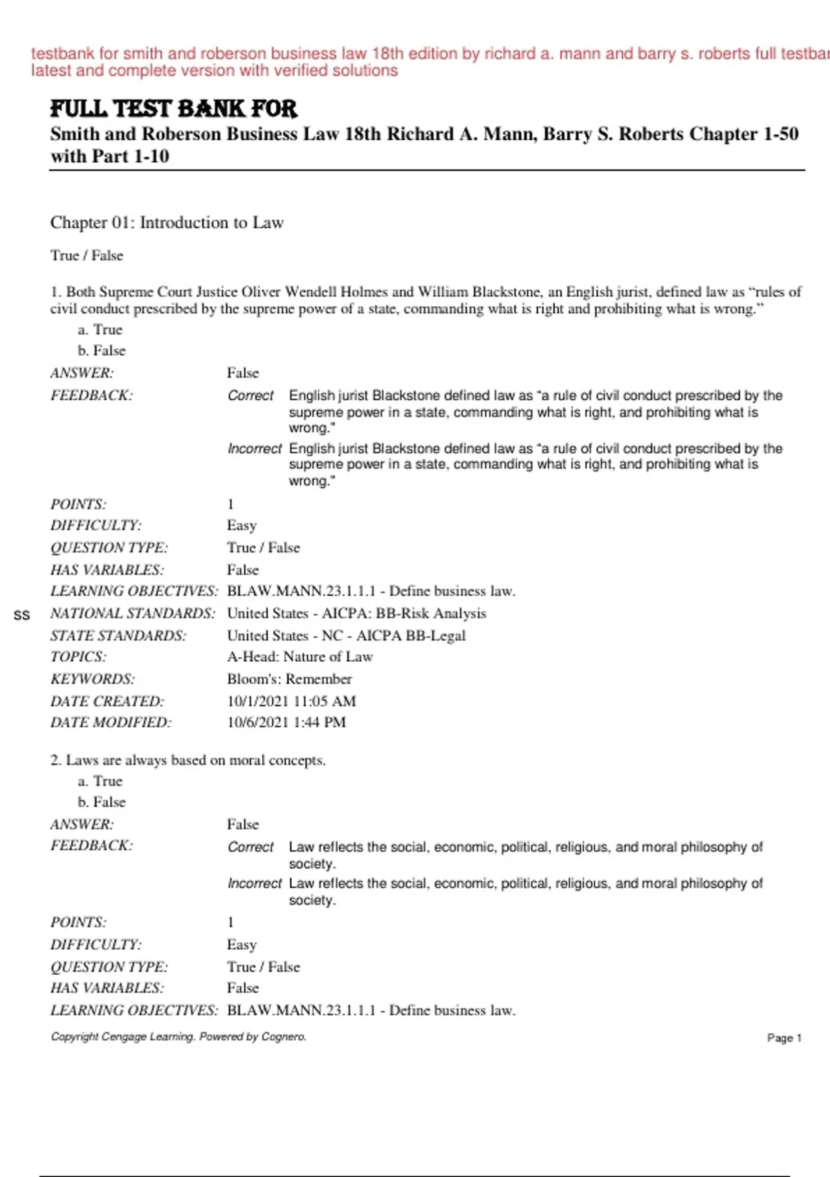 FULL TEST BANK FOR Smith and Roberson Business Law 18th Richard A. Mann, Barry S. Roberts Chapter 1-50 with Part 1-10