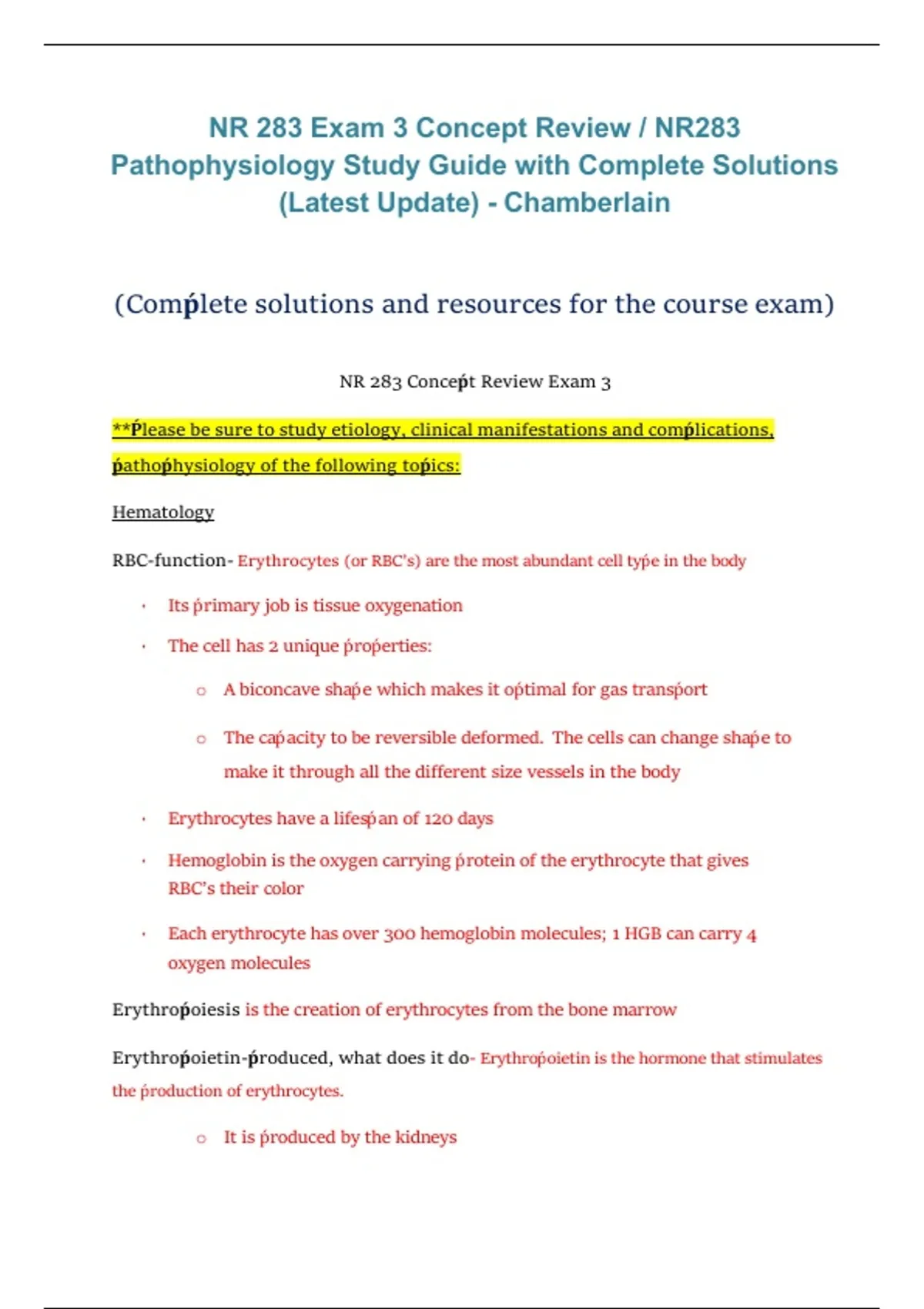 This document is an updated concept review and study guide for NR 283 Exam 3 at Chamberlain, focusing on the pathophysiological concepts and system disorders assessed in this exam. It includes clearly organized review content with complete solutions designed to support understanding and effective exam preparation for the 2026/2027 academic year.
