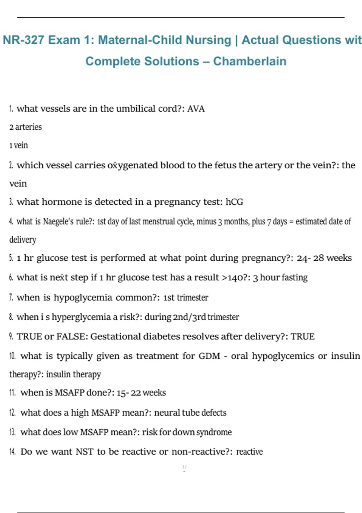 This document includes actual NR-327 Exam 1 questions with complete and accurate solutions for Maternal-Child Nursing at Chamberlain University. It covers core exam topics such as pregnancy assessment, maternal adaptations, prenatal care, common complications, and foundational newborn concepts aligned with the 2026/2027 curriculum. The material is organized to support focused study and reliable exam preparation.