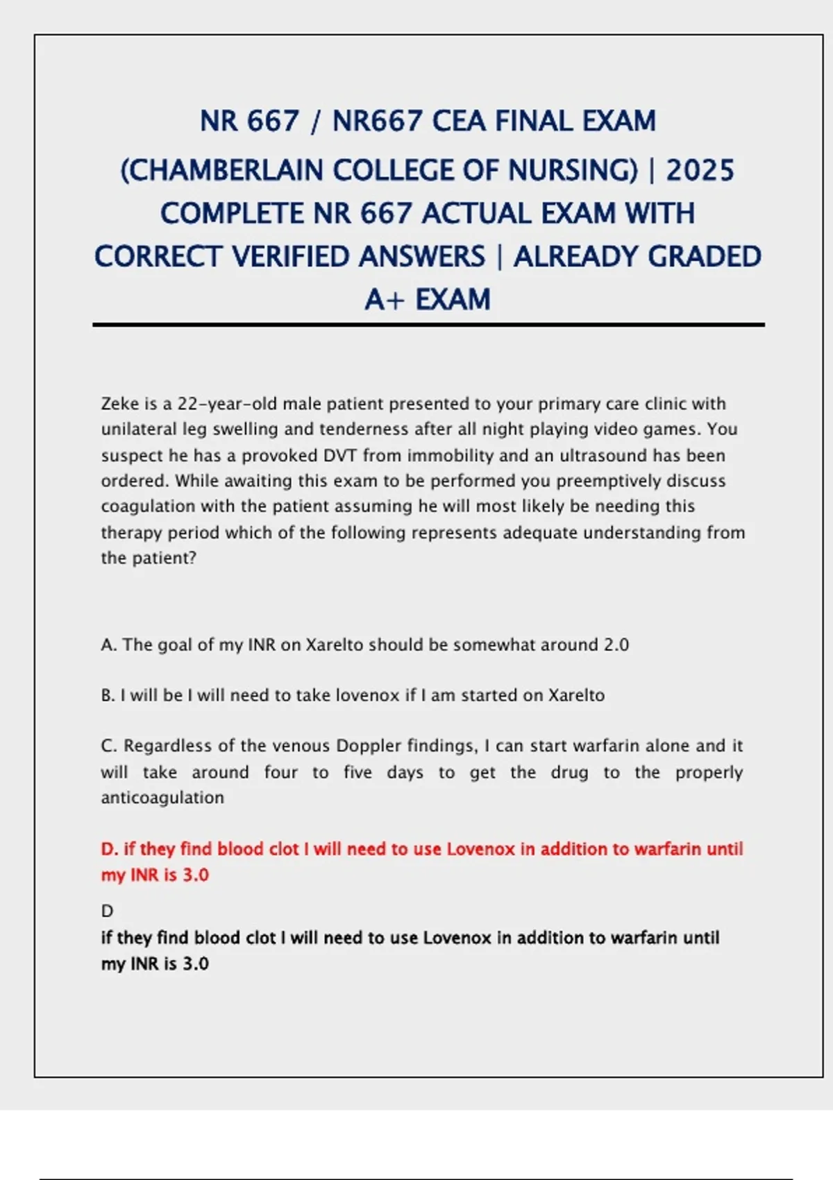 Prepare for the NR 667 CEA Final Exam 2025 at Chamberlain College of Nursing with accurate real exam questions and verified correct answers. This complete NR667 exam prep resource is already graded A+ and supports students in mastering psychiatric mental health concepts, clinical decision-making, and exam success with confidence.