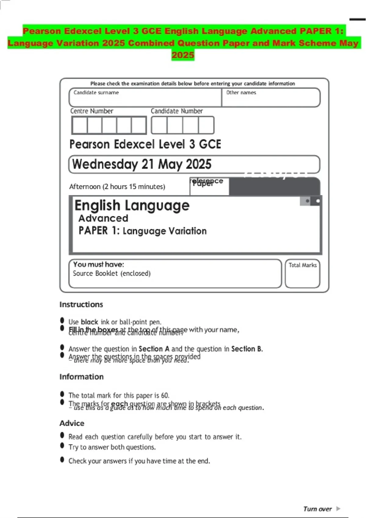 Pearson Edexcel Level 3 GCE English Language Advanced PAPER 1: Language Variation 2025 Combined Question Paper and Mark Scheme May 2025