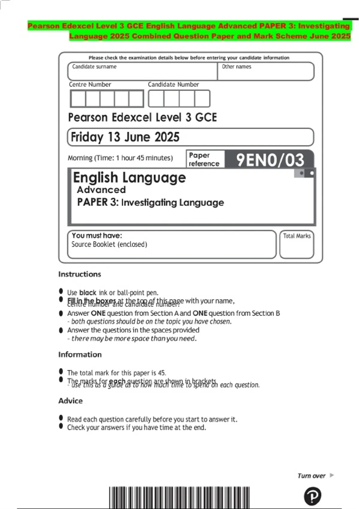 Pearson Edexcel Level 3 GCE English Language Advanced PAPER 3: Investigating Language 2025 Combined Question Paper and Mark Scheme June 2025