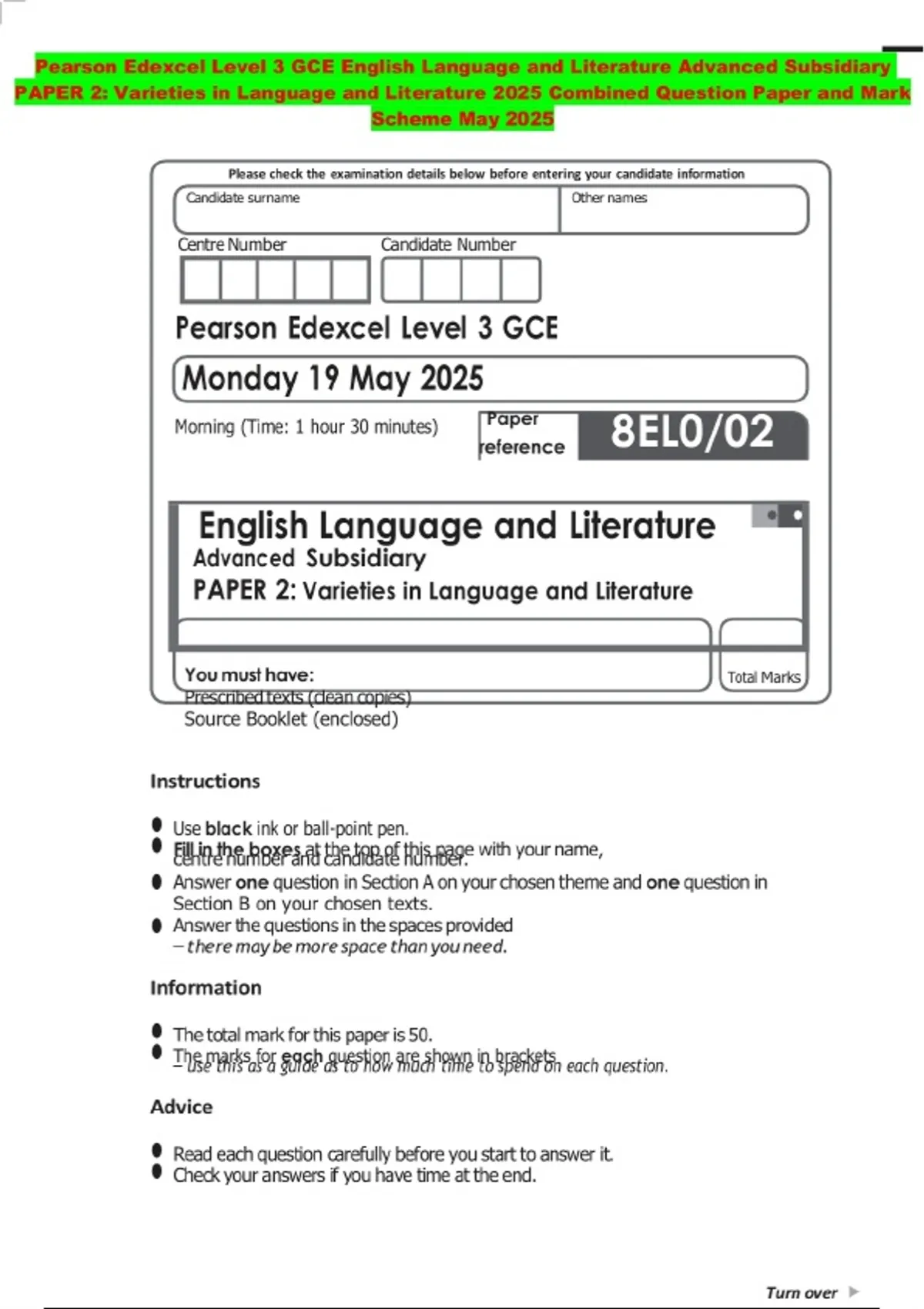 Pearson Edexcel Level 3 GCE English Language and Literature Advanced Subsidiary PAPER 2: Varieties in Language and Literature 2025 Combined Question Paper and Mark Scheme May 2025