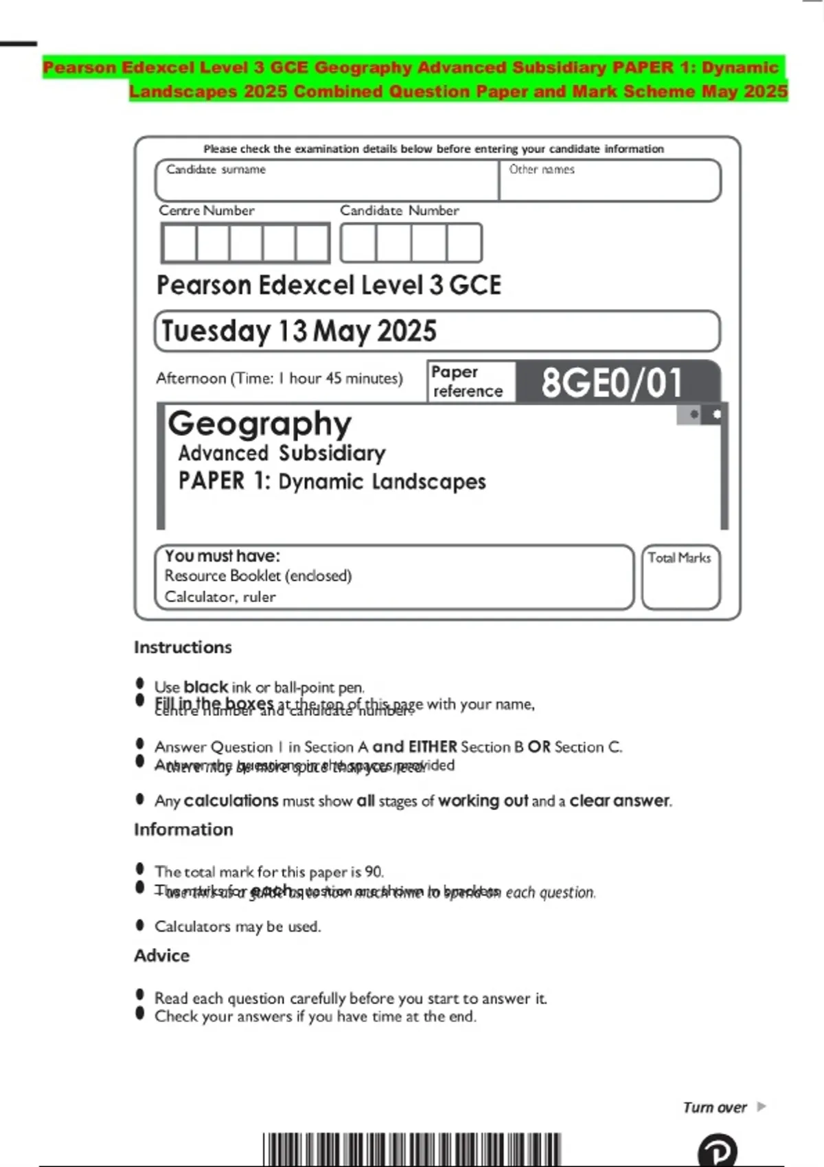 BUNDLE:::Pearson Edexcel Level 3 GCE Geography 2025 Combined Question Paper and Mark Scheme