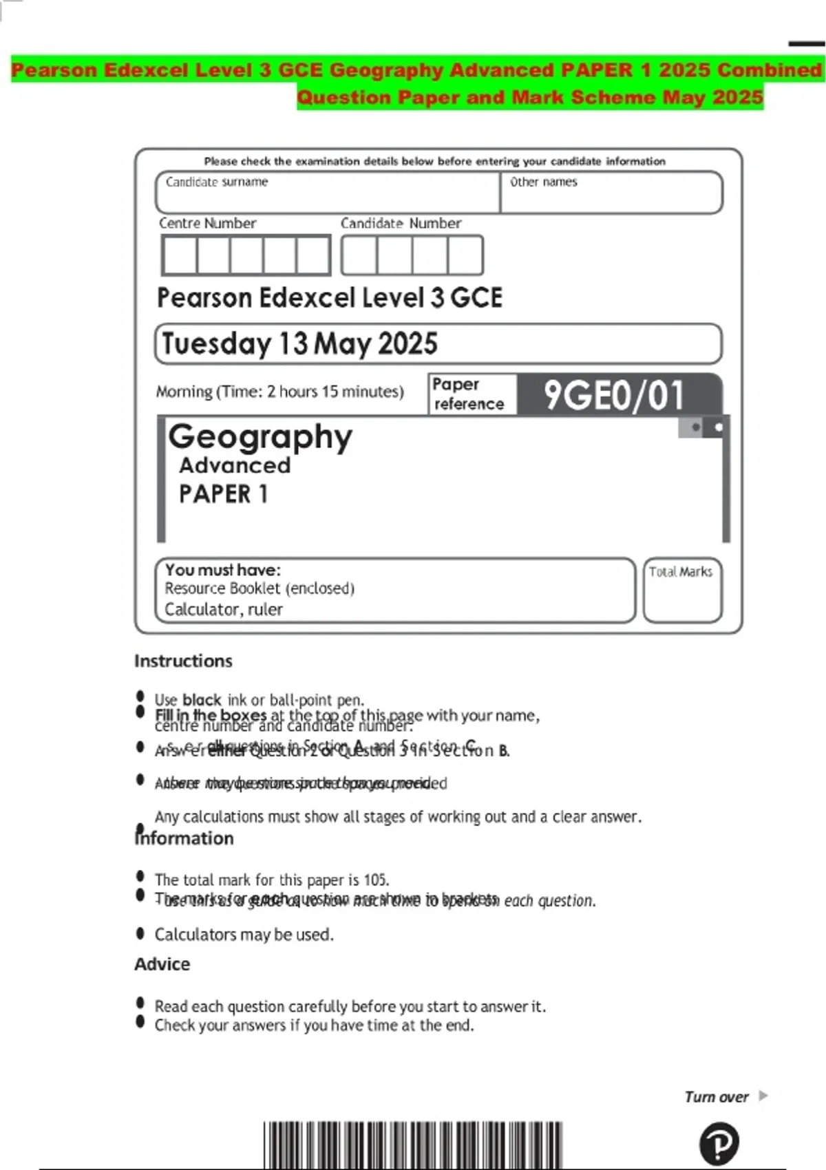 Pearson Edexcel Level 3 GCE Geography Advanced PAPER 1 2025 Combined Question Paper and Mark Scheme May 2025