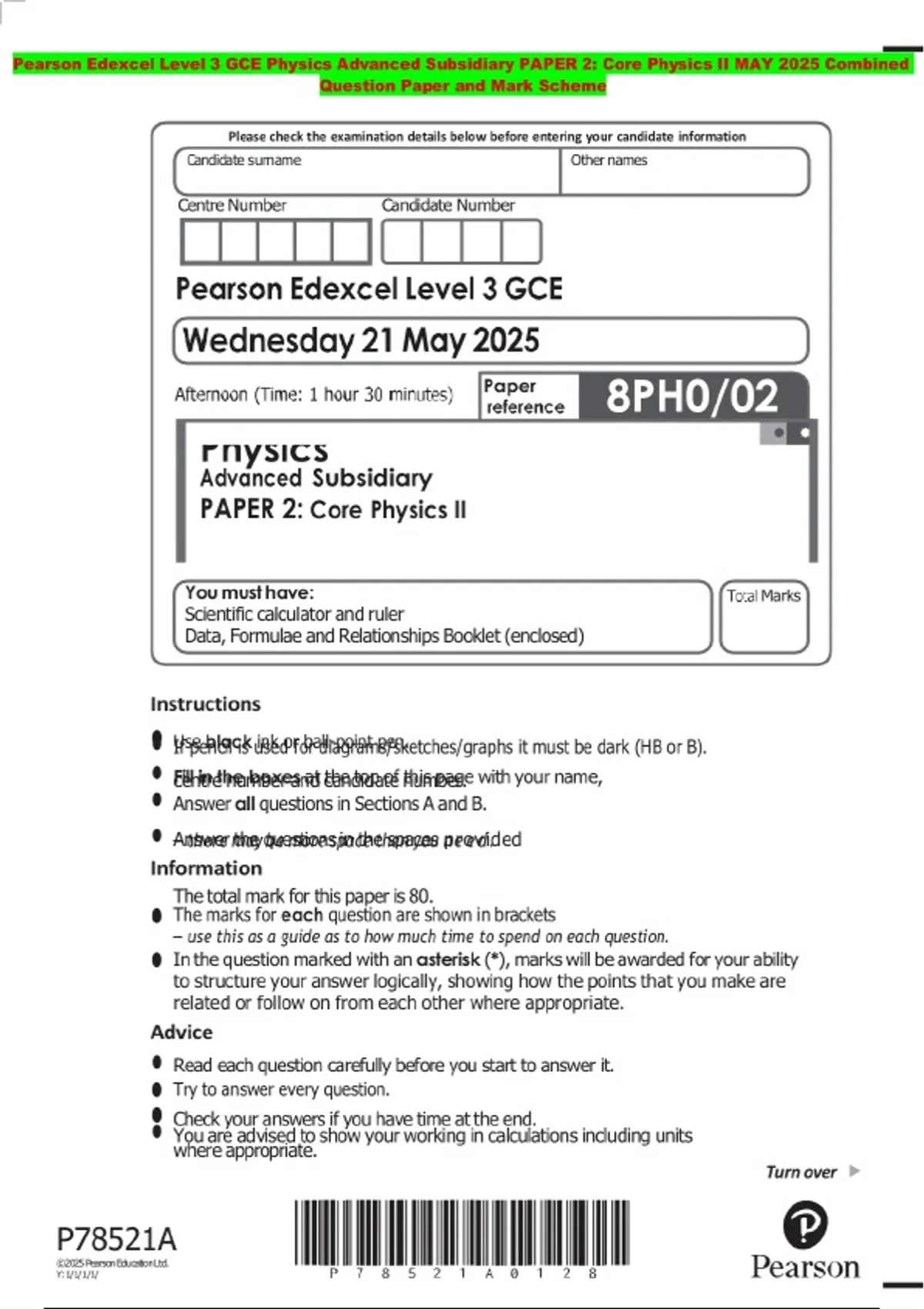 BUNDLE:::Pearson Edexcel Level 3 GCE Physics Advanced 2025 Combined Question Paper and Mark Scheme