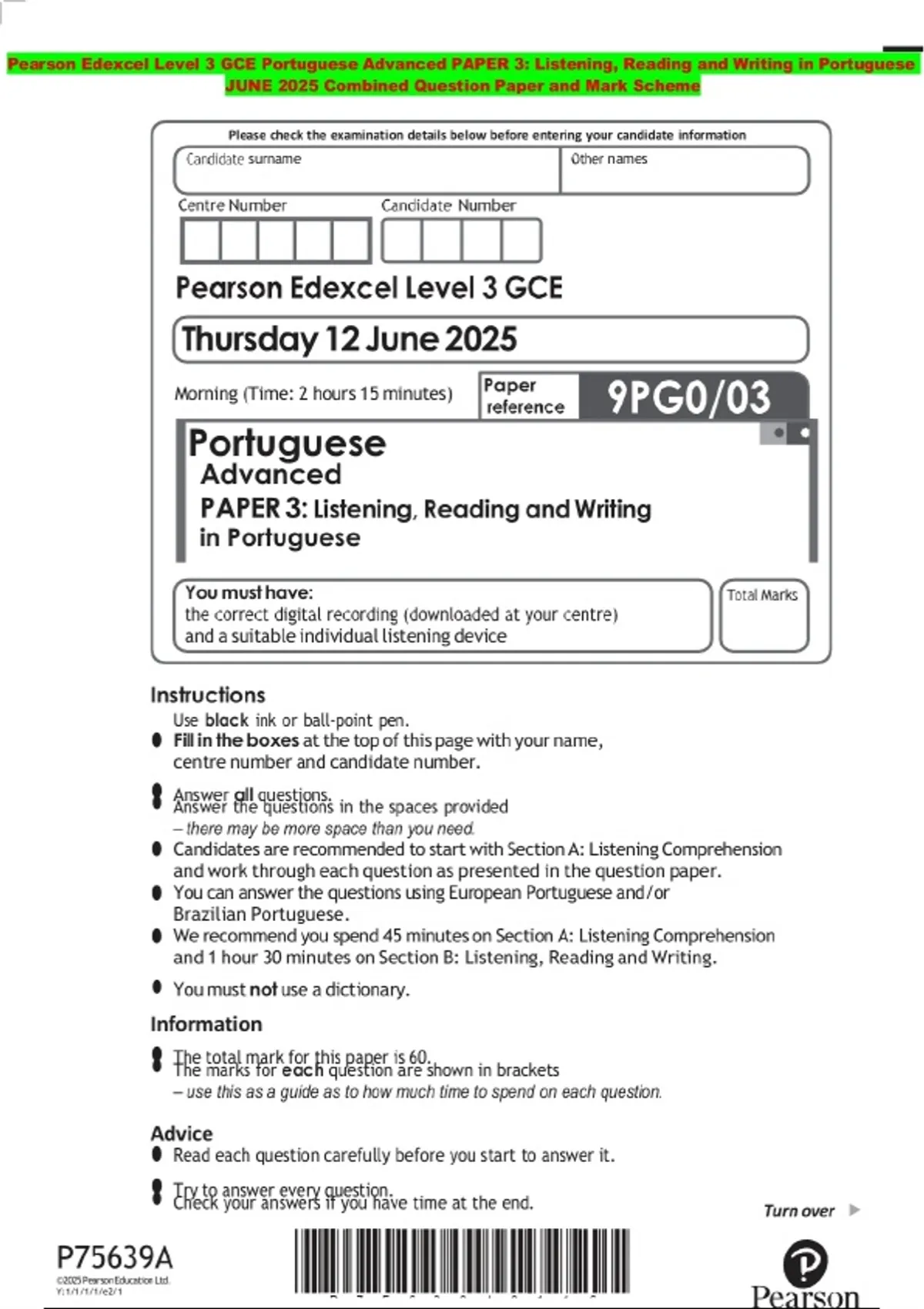 Pearson Edexcel Level 3 GCE Portuguese Advanced PAPER 3: Listening, Reading and Writing in Portuguese JUNE 2025 Combined Question Paper and Mark Scheme