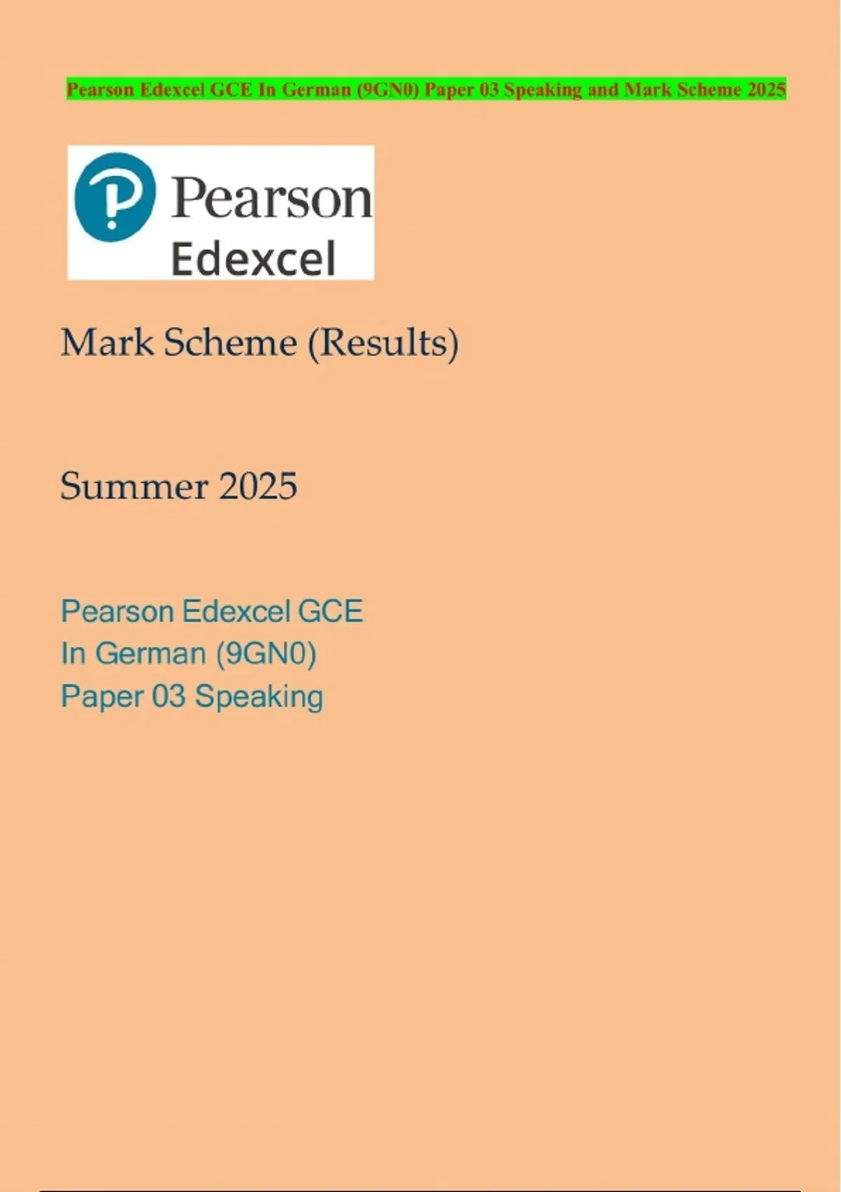 Pearson Edexcel GCE In German (9GN0) Paper 03 Speaking and Mark Scheme 2025