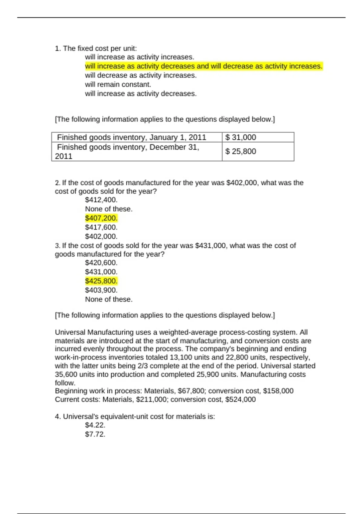 The document contains information about cost accounting concepts and calculations. It provides data about inventory amounts, costs of goods sold, manufacturing costs, overhead rates, and activity-based costing. It asks 28 multiple choice questions related to these topics.
