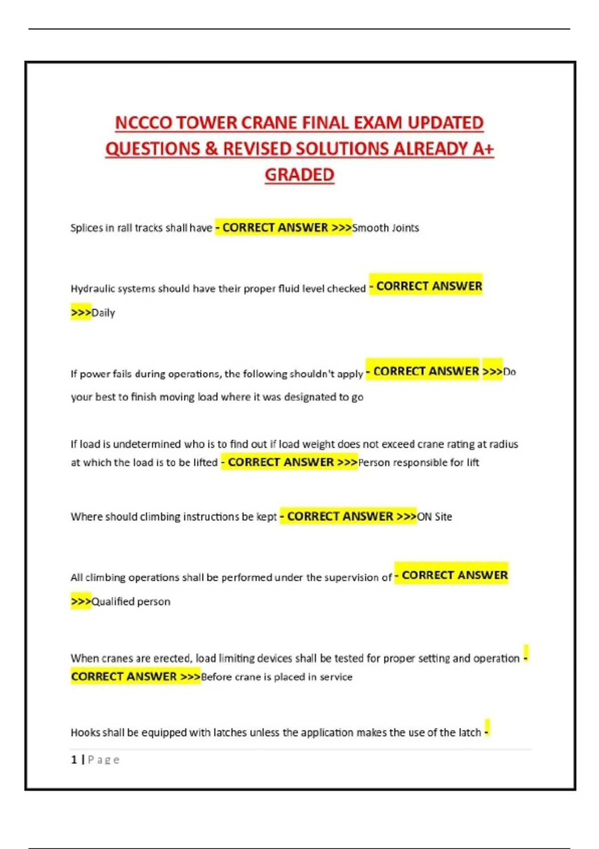 NCCCO TOWER CRANE FINAL EXAM UPDATED QUESTIONS & REVISED SOLUTIONS ALREADY A+ GRADED