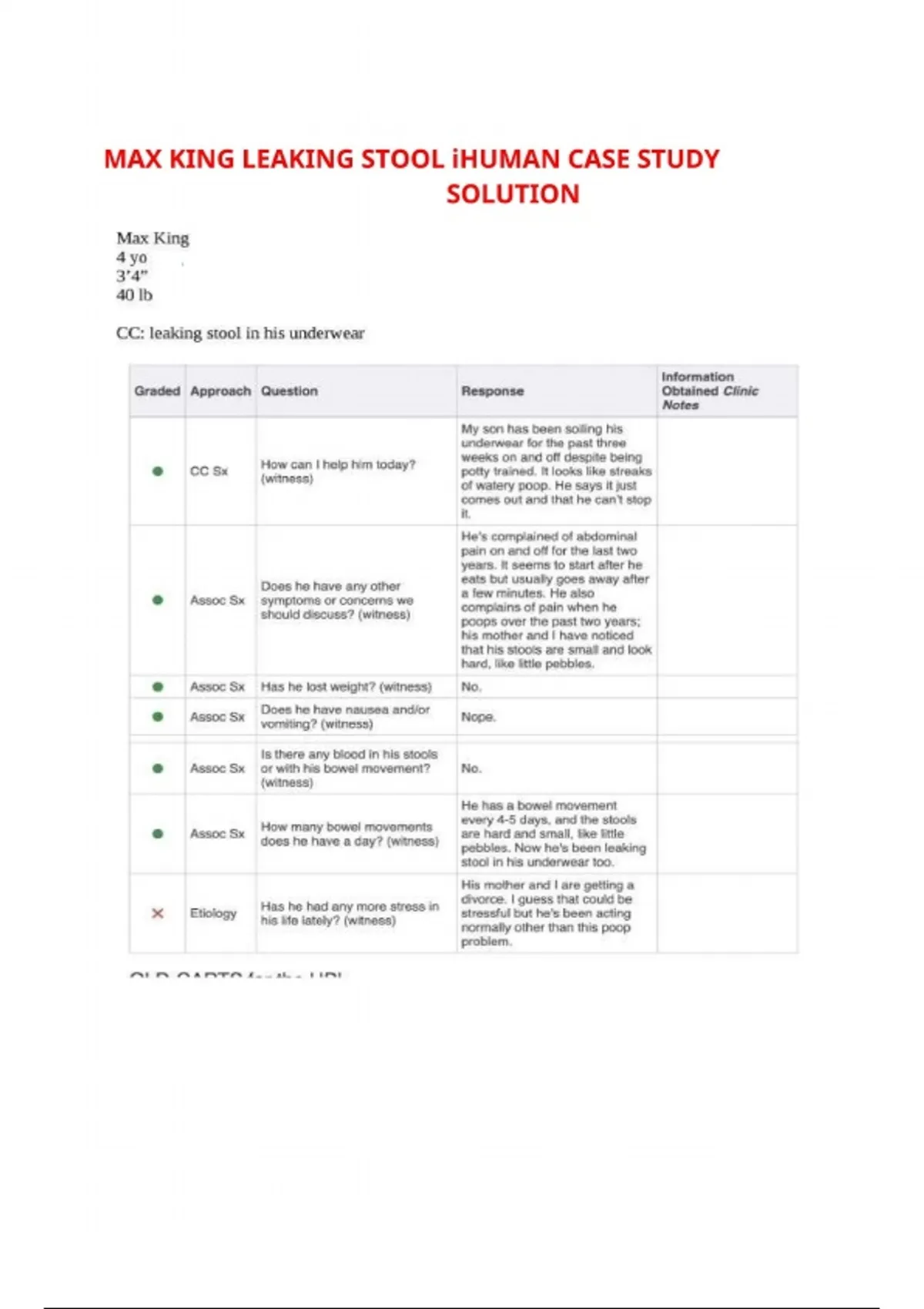 This document covers the complete solution for the Max King I-Human case study presenting with leaking stool. It includes structured clinical reasoning with assessment findings, diagnostic evaluation, differential diagnoses, and an evidence-based management plan. The content aligns with I-Human objectives and supports accurate case completion and performance improvement.