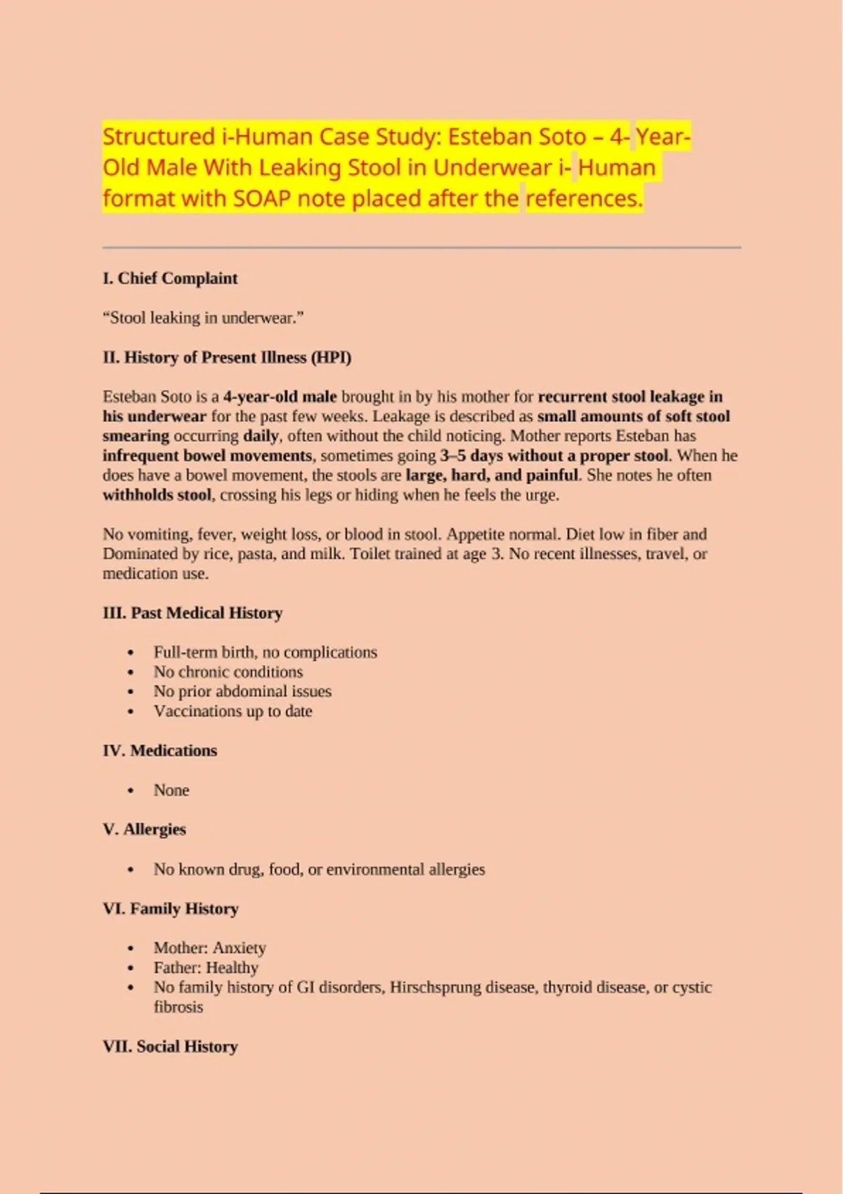 This document covers a fully structured I-Human case study for Esteban Soto, a 4-year-old male presenting with leaking stool in his underwear. It follows the I-Human clinical format, including history, physical exam, diagnostic reasoning, differential diagnosis, and management plan, with a SOAP note placed after the references as requested. The content supports pediatric assessment, clinical reasoning development, and coursework or exam preparation.