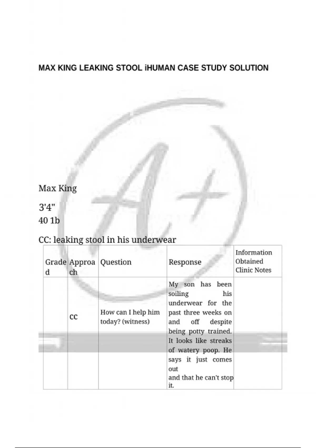 This document covers the complete solution for the Max King I-Human case study presenting with leaking stool. It includes structured clinical reasoning with assessment findings, diagnostic evaluation, differential diagnoses, and an evidence-based management plan. The content aligns with I-Human objectives and supports accurate case completion and performance improvement.