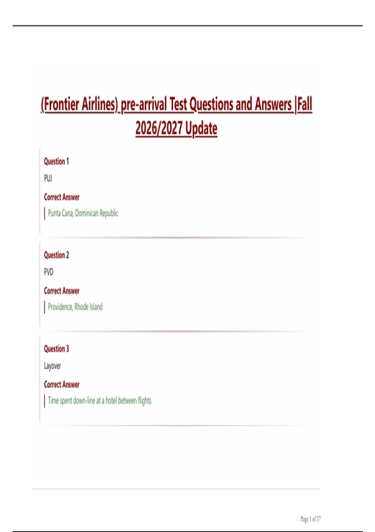 (Frontier Airlines) pre-arrival Test Questions and Answers |Fall