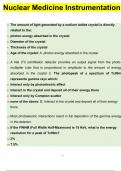 Nuclear Medicine Instrumentation Exam Questions with 100% Correct Answers The amount of light generated by a sodium iodide crystal is directly related to the: A. photon energy absorbed in the crystal B. Diameter of the crystal C. Thickness of the crystal D. Age of the crystal - answerA. photon energy absorbed in the crystal A NaI (Tl) scintillation detector provides an output signal from the photo-multiplier tube that is proportional in amplitude to the amount of energy absorbed in the crystal T...