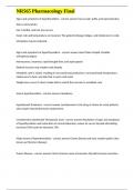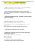 Who determines and regulates prescriptive authority? - correct answer Determines: Also known as independent prescribing. APRNS can prescribe without limit... i x Exam (elaborations) • 20 pages • by Beckham • uploaded 2025 Quick View i x NR565 • NR565 NR565 Midterm Study exam questions with verified correct answers (0) $11.19 0x sold APRN prescribing role - correct answer Prescriptive authority for nurse practitioners also regulates prescribing rights beyond medications and controlled substances. These rights include therapeutic devices and services and are outlined in state practice laws and regulations and include Durable Medical Equipment (DME) such as wheelchairs, power scooters, hospital beds, portable oxygen equipment, handicap placards, etc. and medical services such as Physical Therapy (PT), Occupational Therapy (OT)... i x Exam (elaborations) • 12 pages • by Beckham • uploaded 2025 Quick View i x NR565 • NR565 NR565 Pharmacology Final exam questions and 100% verified answers (0) $11.39 0x sold Signs and symptoms of hypothyroidism - correct answer Face is pale, puffy, and expressionless.