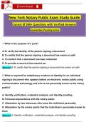 Guarantee Passing score: 85% or higher i x Exam (elaborations) • 47 pages • by cazorlasam • uploaded 2025 Quick View i x New York State Notary Public • New York State Notary Public New York Notary Public Exam Study Guide Consist 0f 300+ Questions with Verified Answers Guarantee Passing score (0) $18.75 0x sold New York Notary Public Exam Study Guide