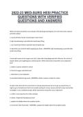 This document contains practice questions and verified answers for the 2022–2023 Medical-Surgical Nursing (MED-SURG) HESI exam. It covers key topics such as cardiovascular, respiratory, endocrine, renal, gastrointestinal, and neurological disorders, including prioritization, pharmacology, lab interpretation, and nursing interventions. The material is structured to reflect HESI-style questioning and includes rationales to support exam preparation and clinical understanding