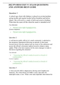 2022 PN HESI EXIT V1 EXAM QUESTIONS AND ANSWERS BEST GUIDEA school-age client with diabetes is placed on an intermediate- acting insulin and regular insulin before breakfast and before dinner. She will receive a snack of milk and cereal at bedtime. What does the nurse tell the client the snack is intended to do?A well-known public official of a small community is admitted to the emergency department following an episode of chest pain.