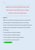 This resource is intended for insurance adjuster trainees, claims professionals, and pre-licensing candidates completing AdjusterPro coursework as part of state insurance adjuster certificatio... i x Exam (elaborations) • 62 pages • by DrEmma • uploaded 2026 Quick View i x Adjust pro • Adjust pro AdjusterPro Final Exam 2025/2026 Latest Actual Exam Questions with Verified Answers and Complete Solutions | Exam Prep Study Guide (0) $12.49 0x sold This comprehensive exam preparation guide is designed for candidates completing the AdjusterPro Final Exam (2025/2026). It features latest actual exam-style questions with verified answers and complete solutions, closely aligned with the AdjusterPro curriculum and state insurance licensing exam standards to support accurate, up-to-date preparation.