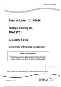 This comprehensive tutorial letter for UNISA's MNG3701 module on Strategic Planning IIIA (2026) serves as an essential introductory resource for students in the Department of Business Management. Delivered fully online via myUnisa, it covers key topics including module outcomes, curriculum transformation, lecturer contacts, prescribed resources like the textbook "Practicing Strategy – A Southern African Context" (3rd edition), study plans, assessment details (assignments and exams), a...