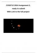 COS3712 Assignment 2 full project 2024 ready to submit COS3712 Assessment 1 and Assessment 2 Assessment 1 and 2 is one project, that is submitted in two parts. 3D Solar System Simulation Objective: Develop a simplified 3D simulation of the solar system, showcasing the sun, planets, and their moons. The simulation will include basic animations to represent planetary rotations and orbits around the sun. Assessment 1 Key Features to Implement: 3D Models for Planets and Moons: Create or i...