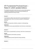 This document is a complete and updated study guide for the ATI Fundamental Proctored Exam, featuring 25 high-yield, examiner-style questions with detailed rationales. It covers essential topics such as specimen collection, tracheostomy care, protein classification, discharge planning, IV complications, and client positioning. Also included are therapeutic communication techniques, accurate assessment procedures, and cultural considerations. Ideal for nursing students preparing for the 2024 edit...
